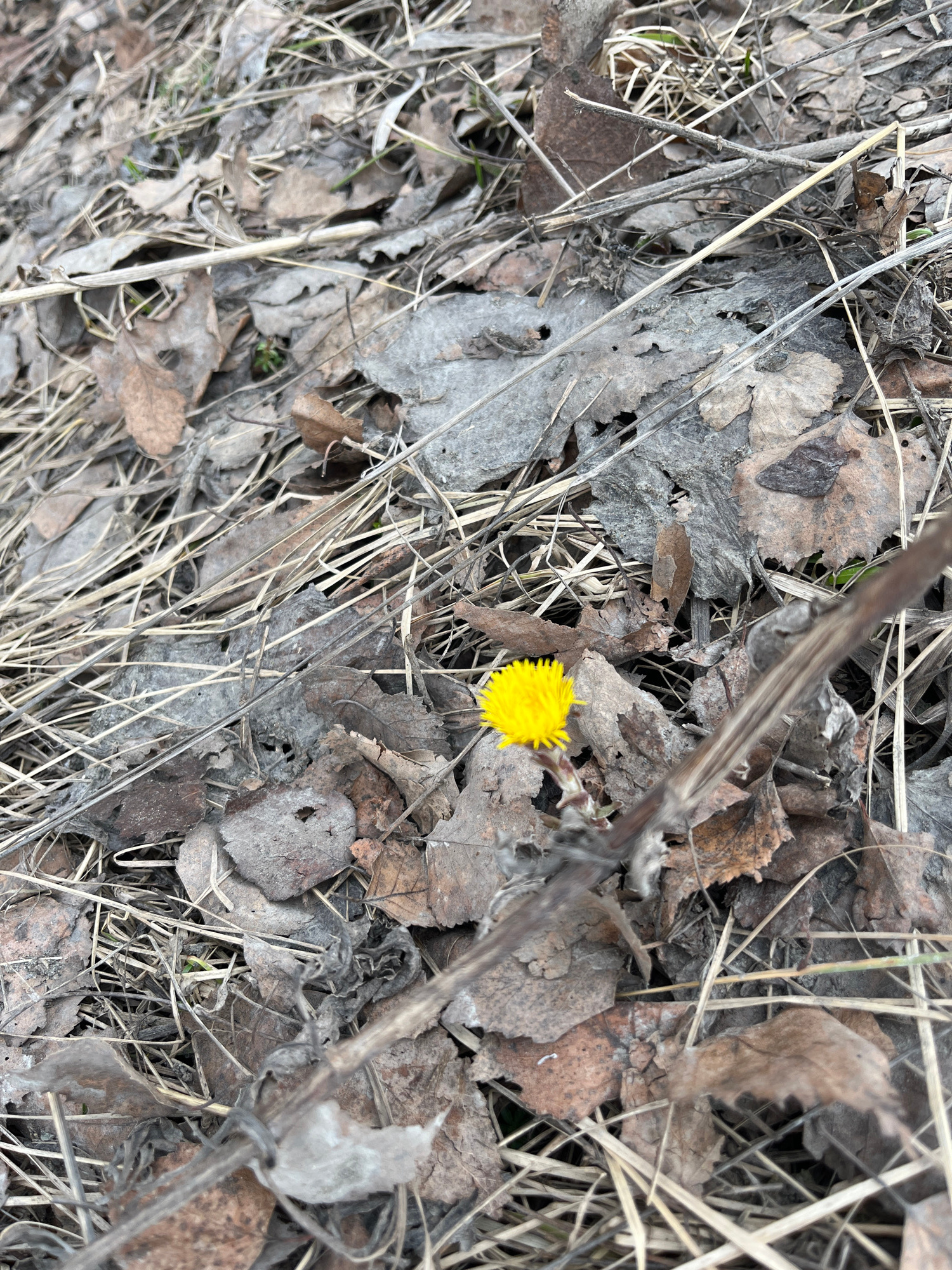 The image shows a patch of ground covered in dry leaves and dead grass. A single yellow flower blooms amidst the debris. The location is possibly Srednii Postol, Russia. There are no people visible in…read more