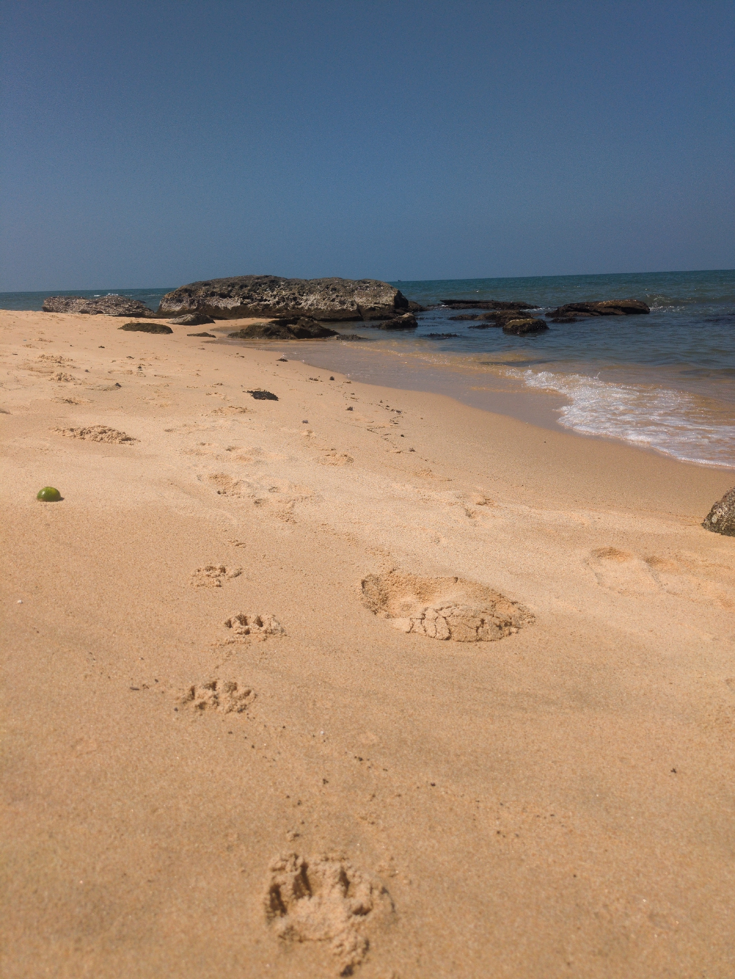 The image shows a sandy beach with scattered rocks along the shoreline. There are waves reaching the sand. Footprints of varying sizes are visible, indicating the presence of humans and possibly anima…read more