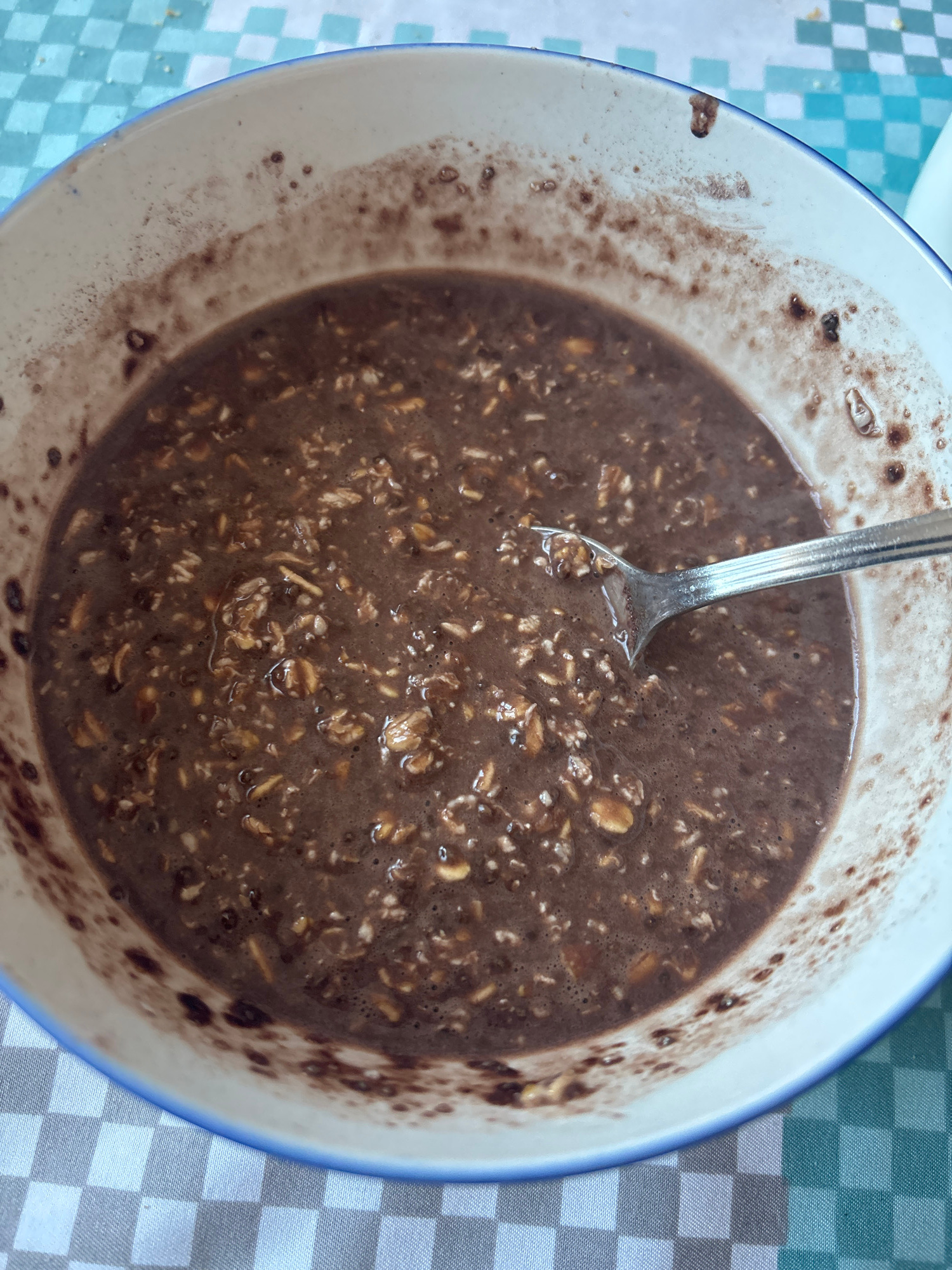 A top-down view shows a bowl filled with a dark brown mixture containing oats, with a metal spoon partially submerged in the center. The bowl has a white interior and a blue rim. Brown splatter marks…read more