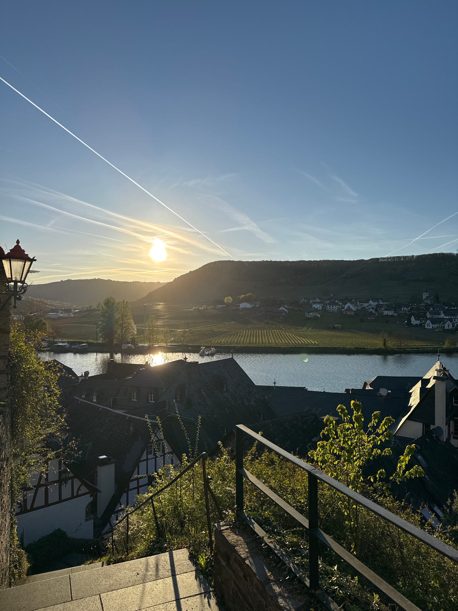 Here is a description of the image: The image shows a view in Beilstein, Germany, with a hill covered in vineyards on the opposite side of a river. The sun is visible near the center of the image, sh…read more