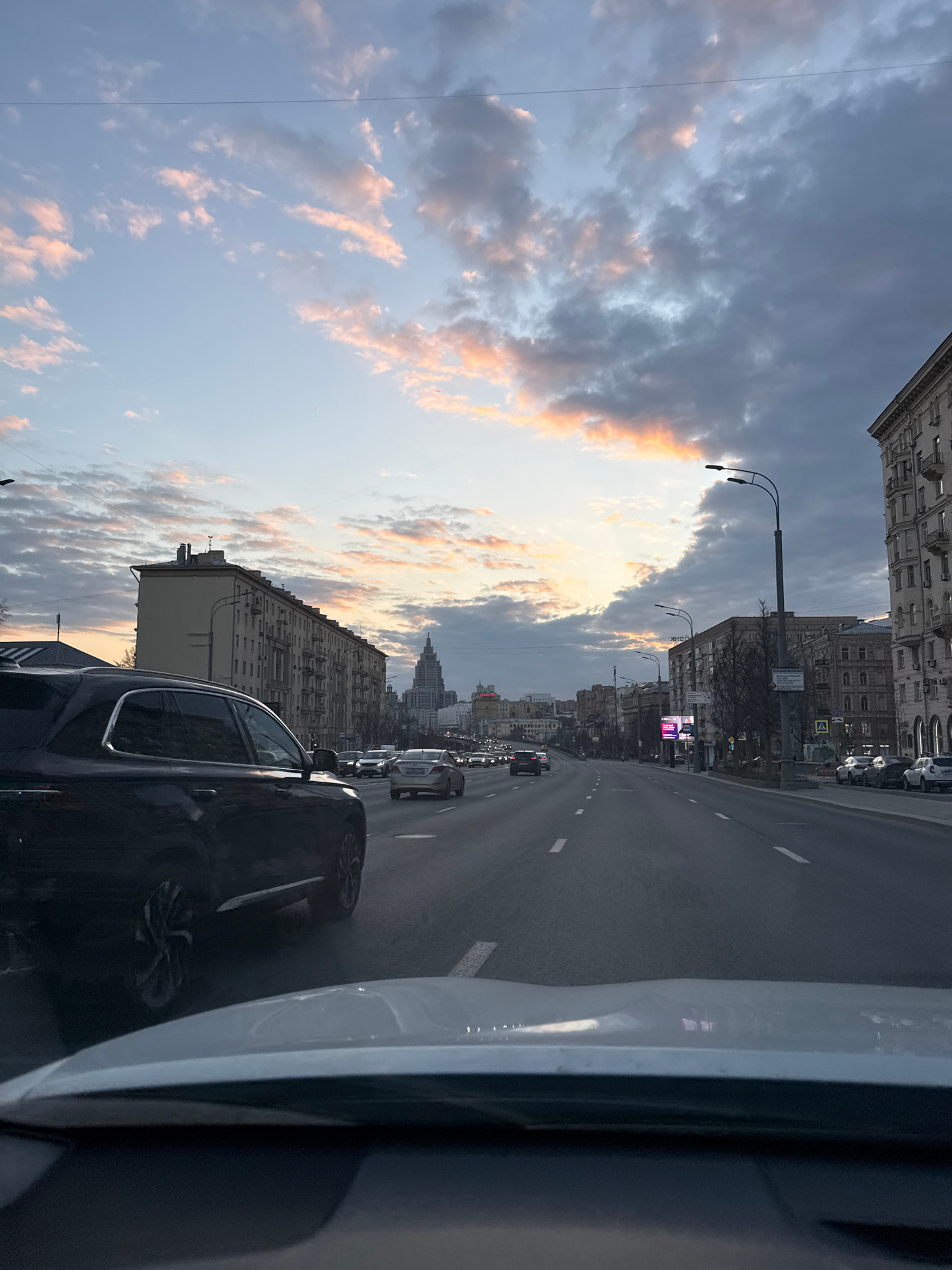 The image shows a view from inside a car, looking out over a city street with multiple lanes of traffic. On either side of the road are tall buildings, suggesting an urban environment. The sky is fill…read more
