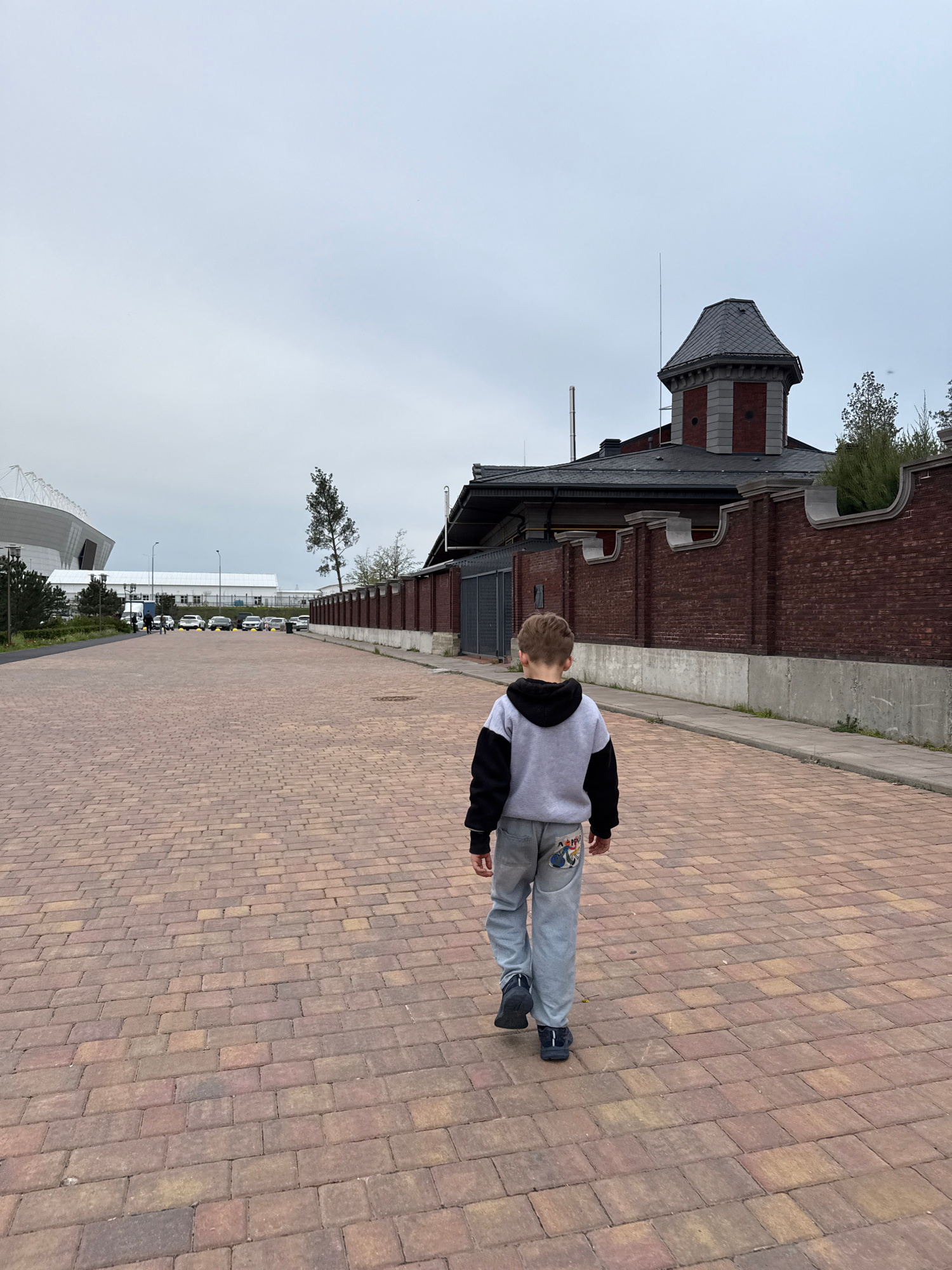 A long, red brick walkway is the primary subject of the image. A child wearing a light grey and black hooded sweatshirt and light grey pants with characters on the leg is walking or standing on the br…read more