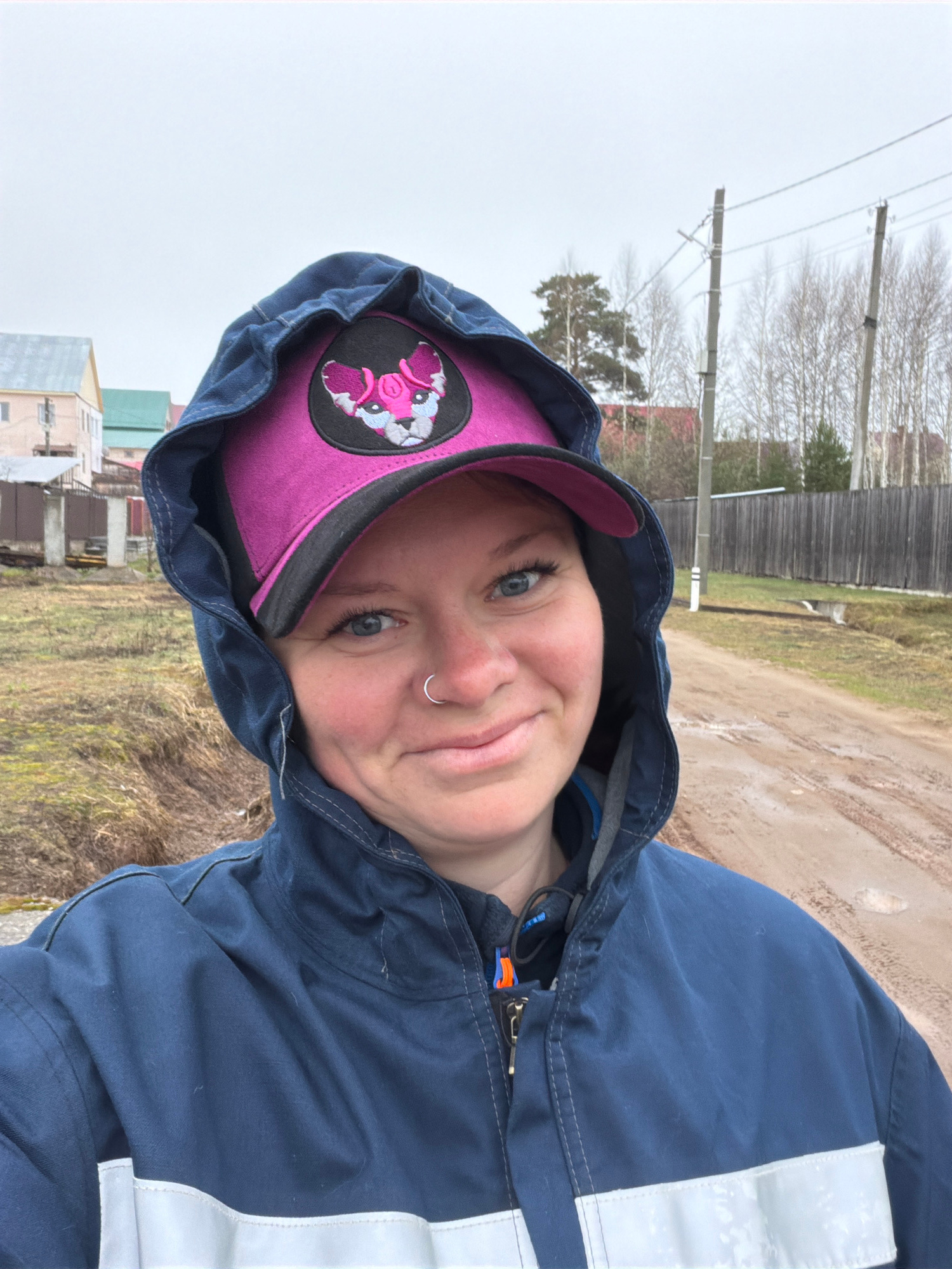 The image is a selfie of a young woman taken outdoors in what appears to be a rural or semi-rural setting in Chaikovsky, Russia. The woman is positioned in the foreground, looking directly at the cameβ¦read more