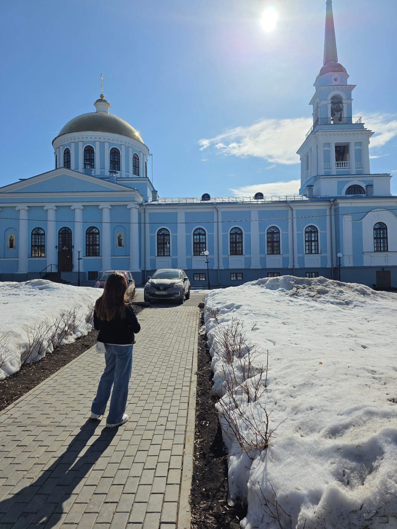 A daylight photograph depicts a scene in Votkinsk, Russia, featuring the Cathedral of the Annunciation (Blagoveshchensky Sobor) as the central subject. The prominent light blue and white religious edi…read more
