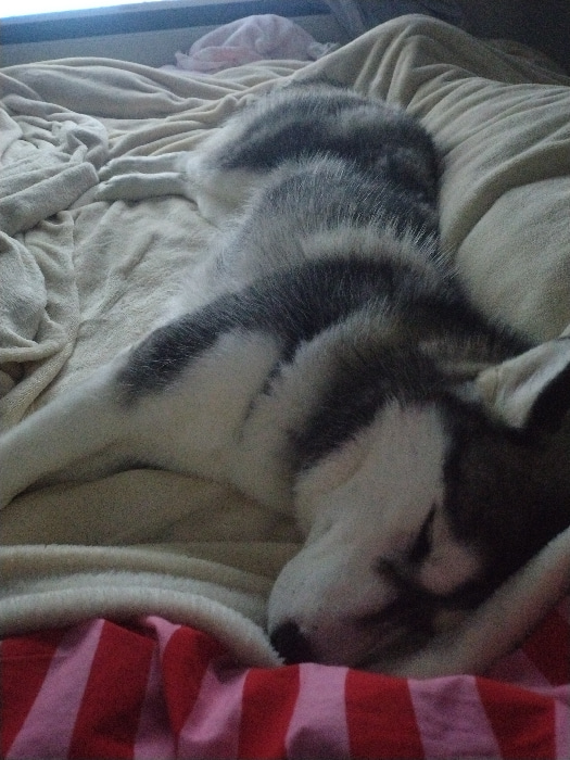 A husky dog is sleeping peacefully on a wrinkled beige blanket. The dog has white and grey fur, and its eyes are closed. A red and pink striped fabric is next to its head. The blanket looks soft and c…read more
