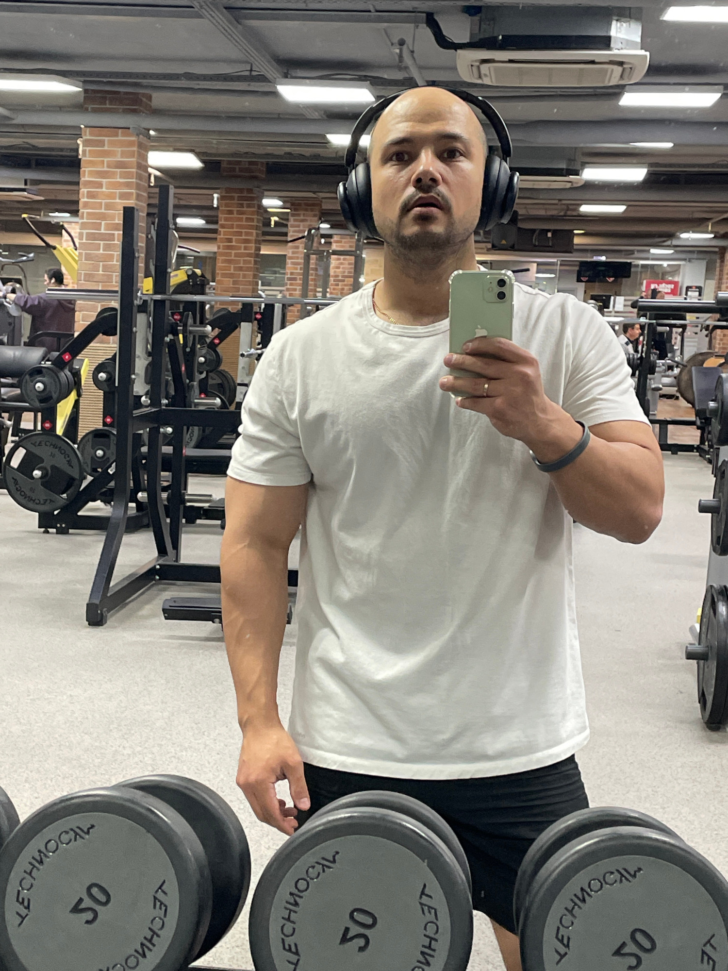 A bald man wearing headphones and a white t-shirt is taking a selfie in what appears to be a gym. He is holding a light green phone in his right hand. The background includes weightlifting equipment a…read more