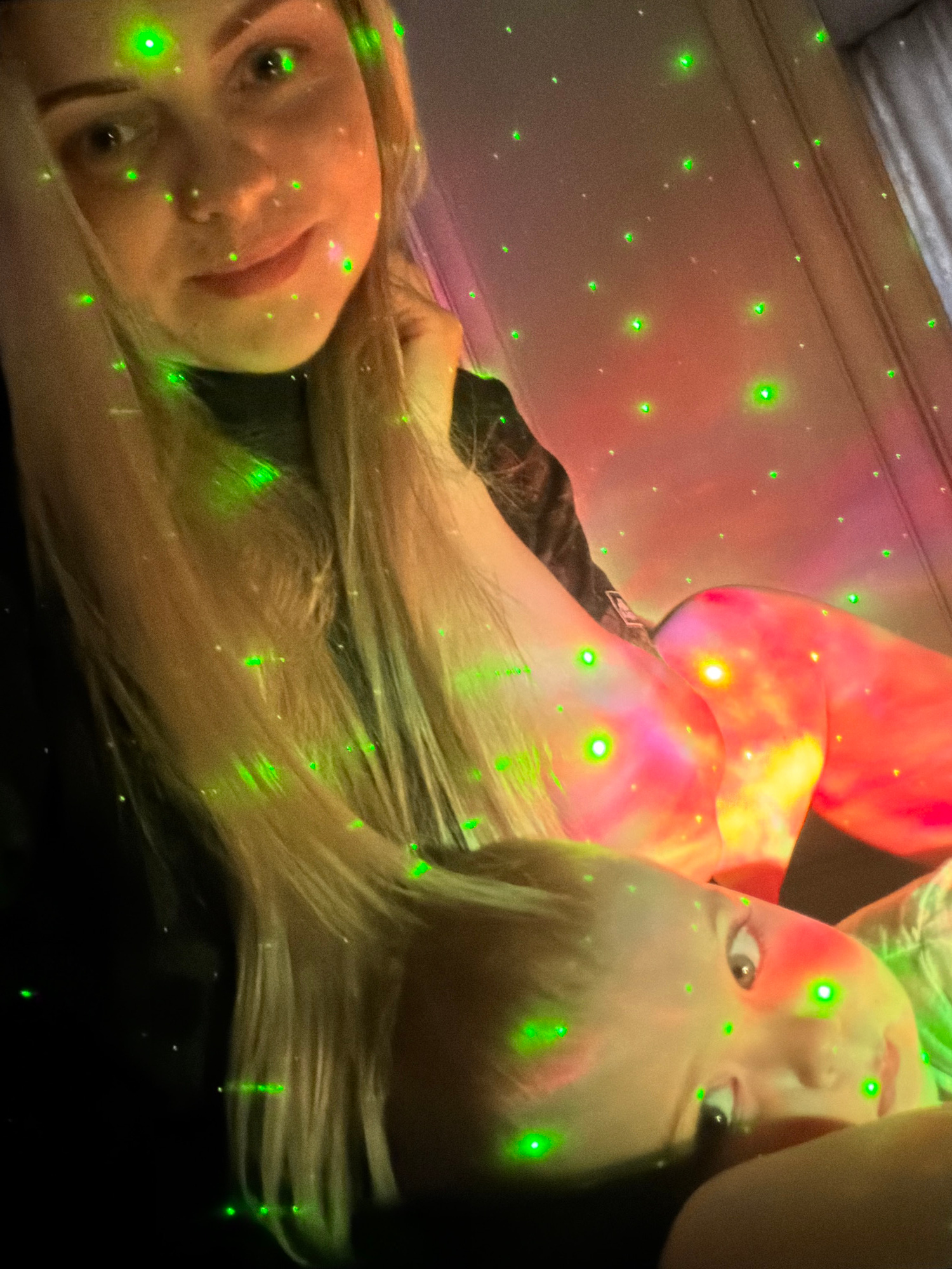 This image captures two individuals, likely women with light blonde hair, in an indoor setting illuminated by a vibrant light projector. The scene is dominated by numerous small, bright green laser-li…read more