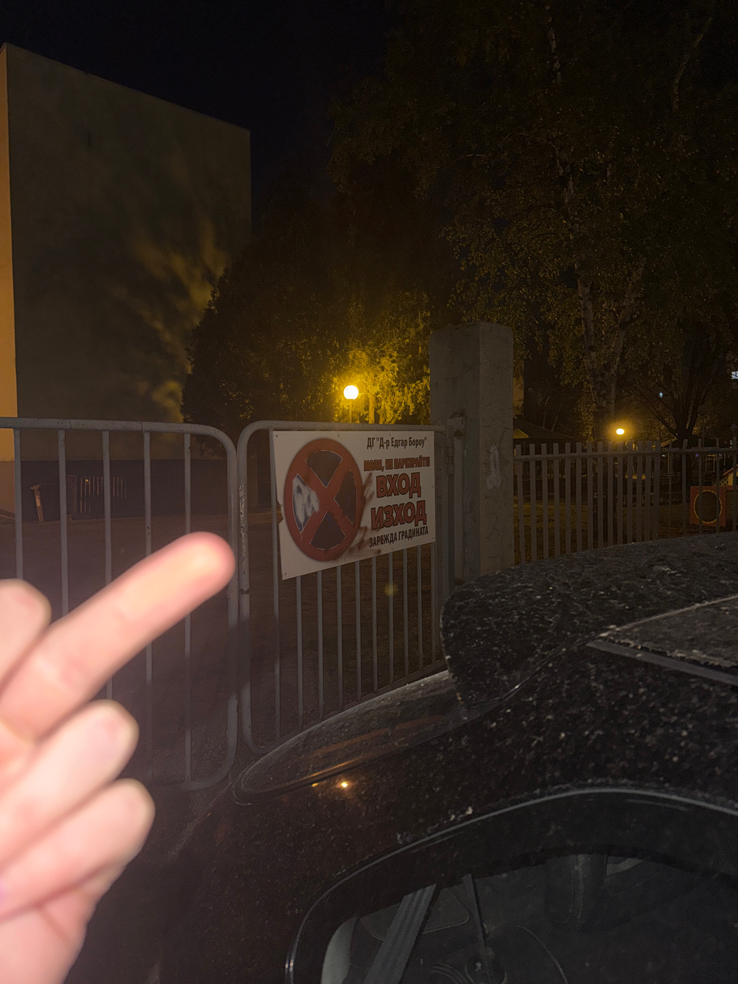 The image depicts an outdoor scene at night, likely taken in Plovdiv, Bulgaria, given the presence of Bulgarian text. The scene is dominated by a portion of a vehicle's tire on the right side of the f…read more