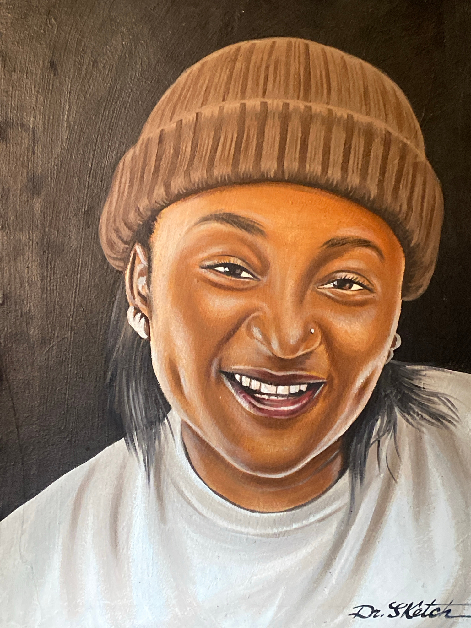 A portrait painting depicting a smiling woman with dark skin, wearing a brown knit hat and a white t-shirt. She has dark hair and a nose piercing. The background is dark brown. The signature "Dr. Sket…read more