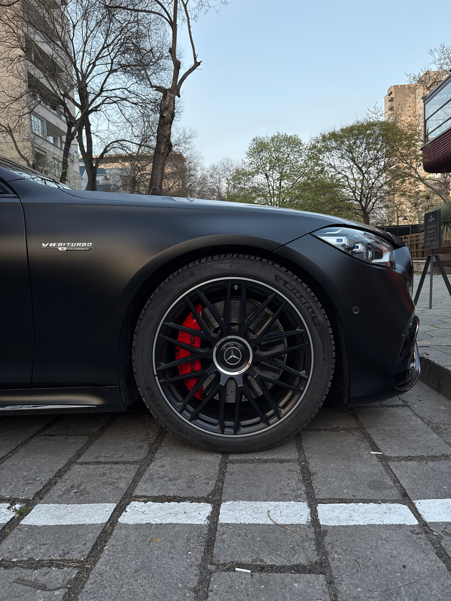 The image shows a close-up of the front of a matte black Mercedes-AMG car, specifically the front left wheel and part of the body. The tire is a Michelin Pilot Alpin. The wheel has a black multi-spoke…read more