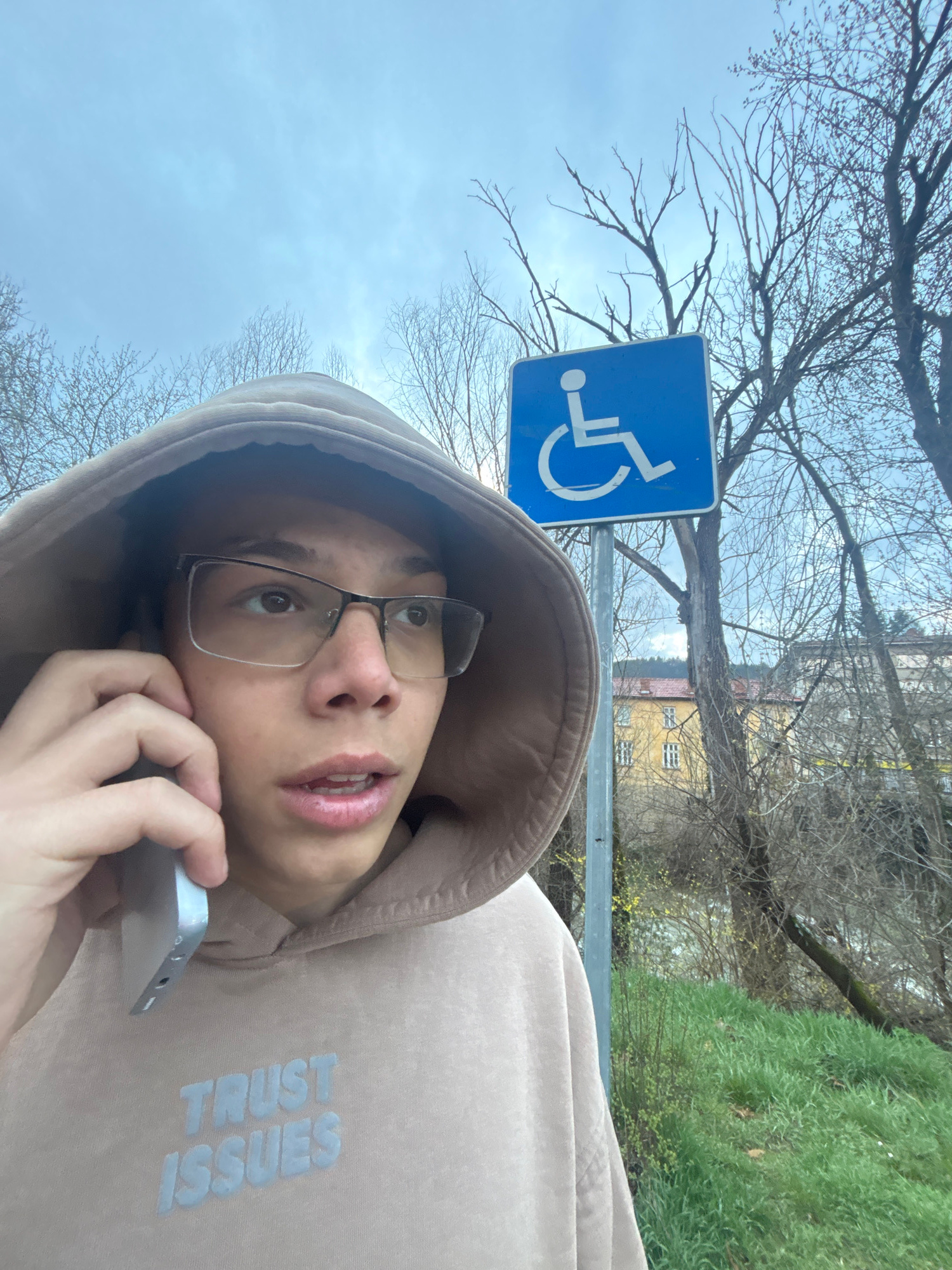 A young person wearing a hooded sweatshirt and glasses holds a smartphone to their ear. They stand near a blue and white handicap parking sign. The background includes bare trees and a building. It isβ¦read more