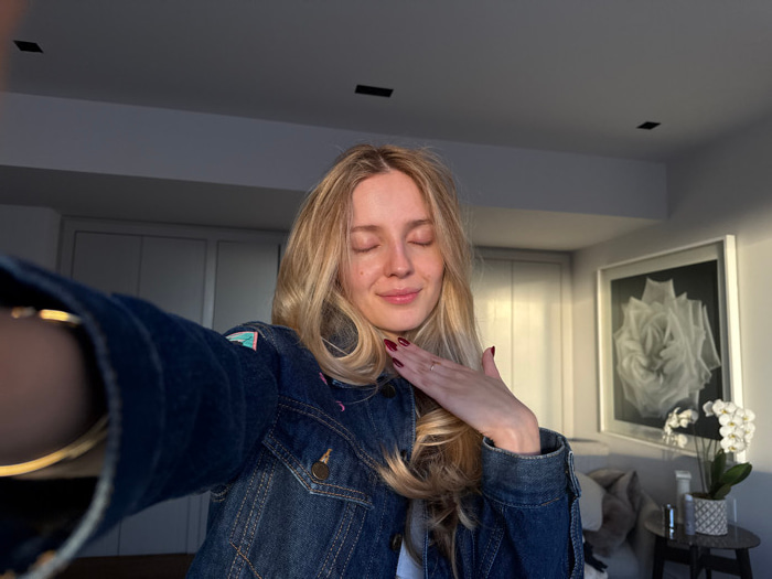 An indoor, eye-level selfie captures a blonde female, approximately 20-30 years old, with her eyes closed and a subtle smile. She wears a blue denim jacket featuring light-colored stitching and a partβ¦read more