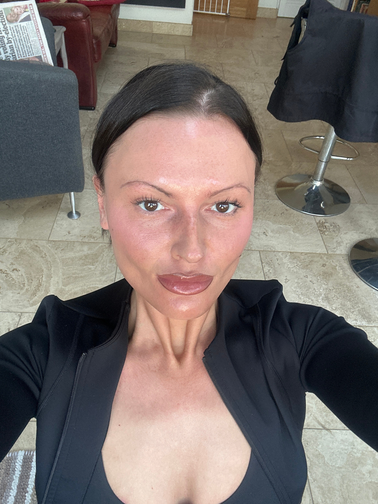 A female subject is centered, framed from the upper chest, gazing directly forward. She has dark hair pulled back, a neutral facial expression, pronounced lips with glossy reddish-brown pigment, and m…read more