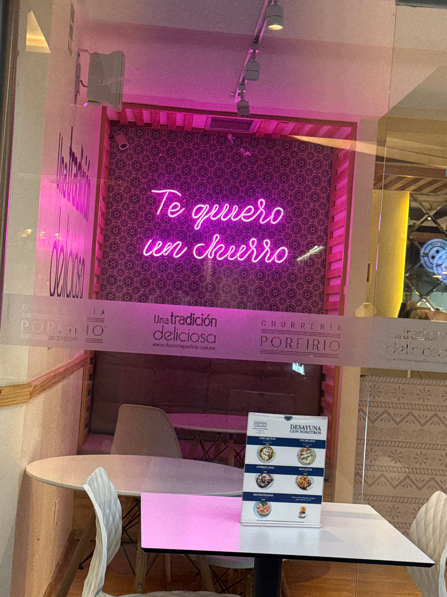 This indoor shot depicts the interior of a restaurant named Churrería Porfirio, located in the city of Puebla, Mexico. The scene is captured through a reflective glass or window. The restaurant's name…read more