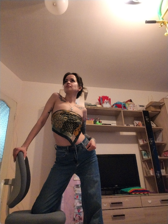 A young woman is captured in an indoor, full-body shot, posing dynamically. She has dark hair styled in a bun or ponytail and fair skin, adorned with numerous tattoos on both arms and shoulders. She iβ¦read more