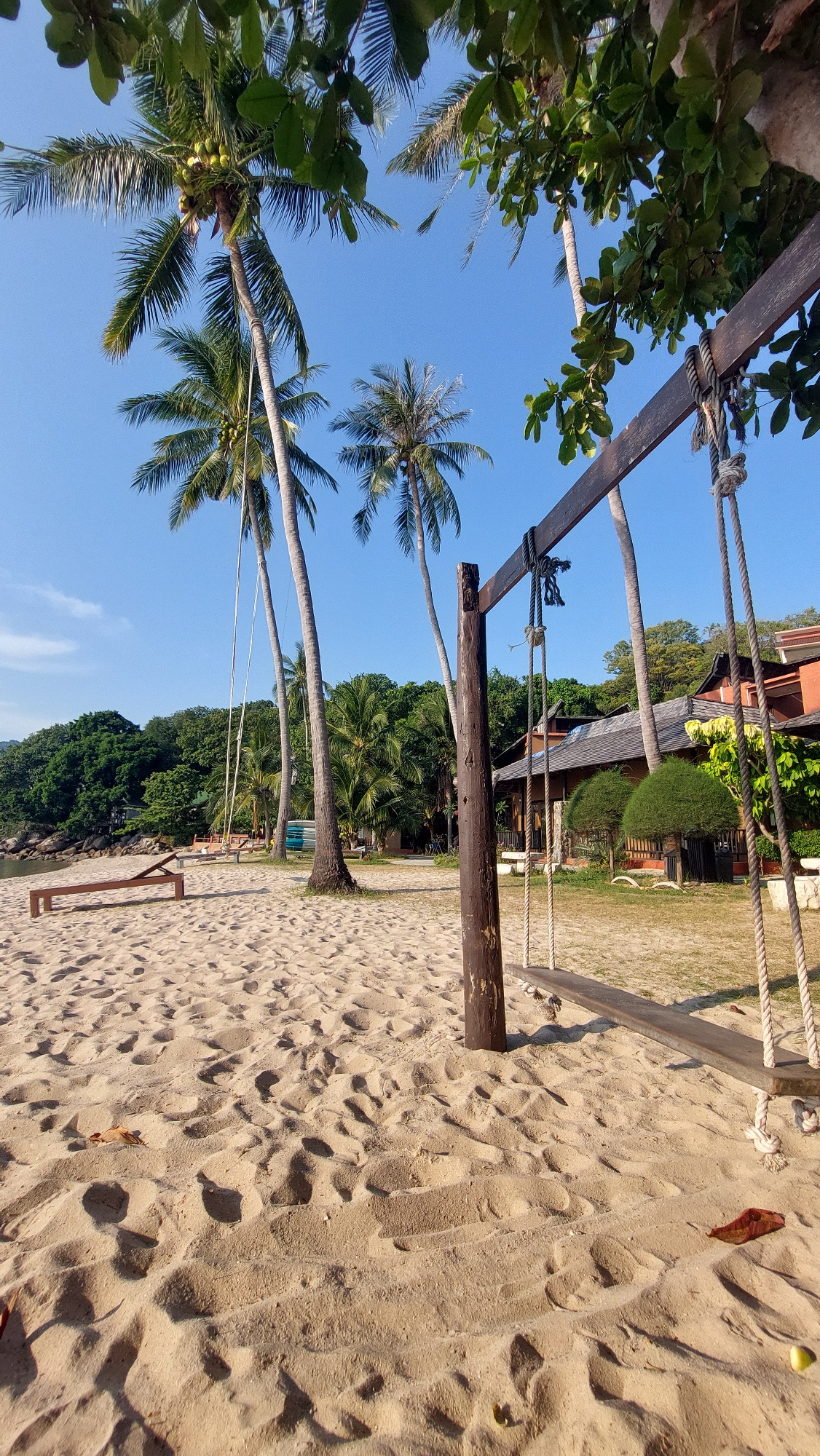 This image captures a vibrant, sunny tropical beach scene, likely located in Tambon Ko Tao, Thailand, as indicated by the context. The photograph is taken from a slightly low angle, looking up towardsβ¦read more