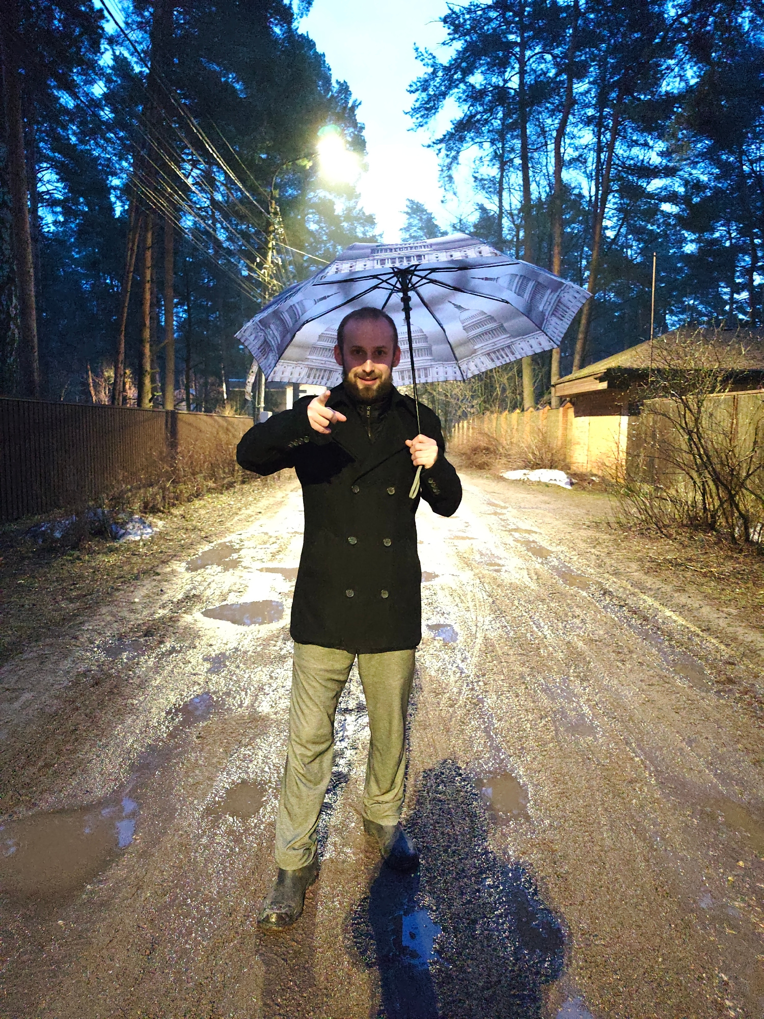 A bearded man stands on a muddy, puddle-filled road under the light of a street lamp in what appears to be a residential area. The man is holding an umbrella decorated with an image of the United Stat…read more