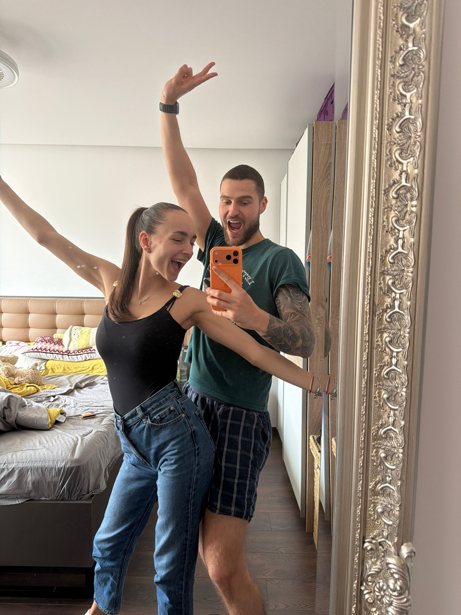 A couple poses for a mirror selfie in what appears to be a bedroom in an apartment or hotel room. The woman is wearing a black bodysuit and blue jeans, while the man is wearing a dark green t-shirt an…read more