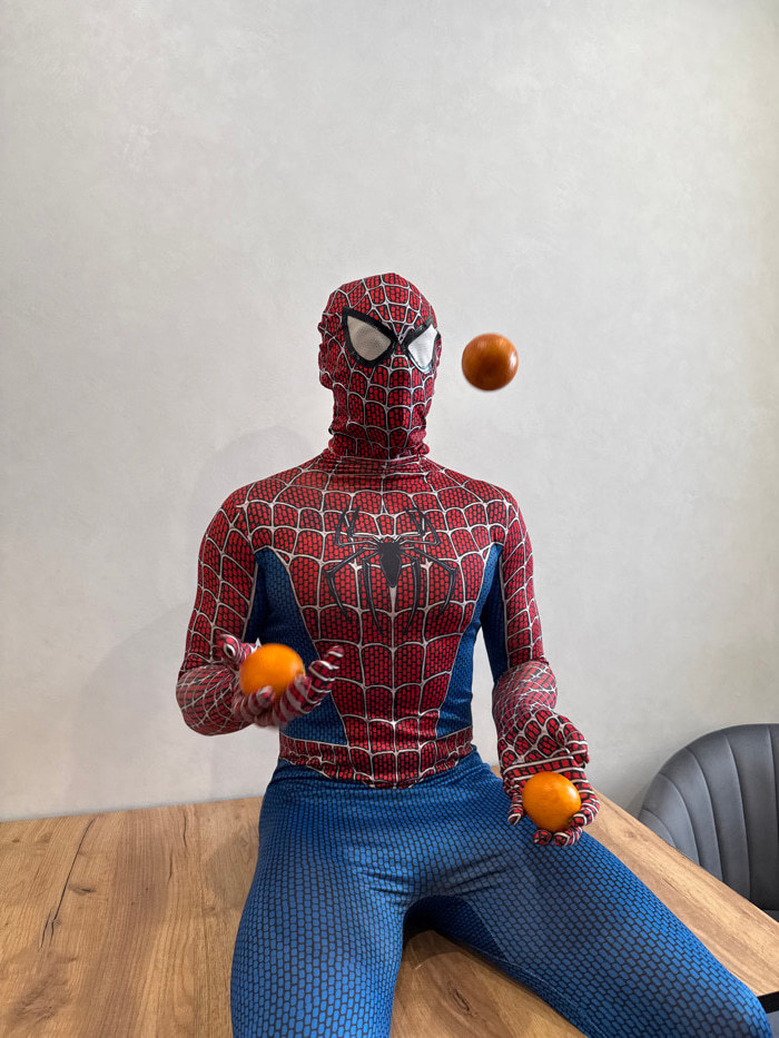 A subject in a full red and blue Spider-Man costume, featuring web patterns and a central black spider emblem, is seated on a light brown wooden surface. The masked head shows white eye lenses. The subject holds one orange in the left hand and another orange in the right hand. A third orange is airborne to the upper right of the subject's head, consistent with a juggling or throwing motion. The background is a plain, light grey textured wall. A dark grey upholstered chair is partially visible on the right. The scene is indoors. No specific identifying markers for a location within Kazan, Russia, are present. | Open Wire