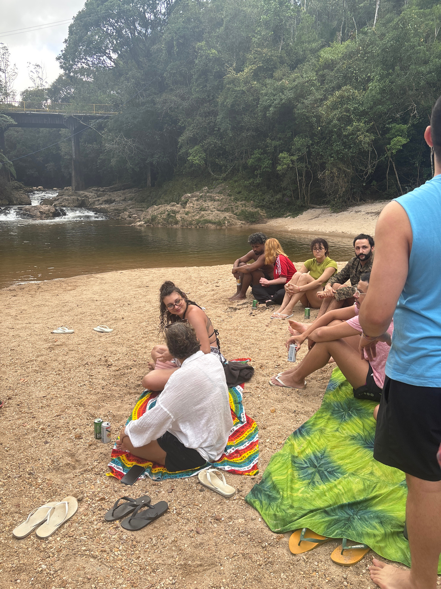 A group of people are gathered on a sandy bank next to a body of water, likely a river or lake, with trees visible in the background. From foreground to background, on the right side of the frame, are…read more