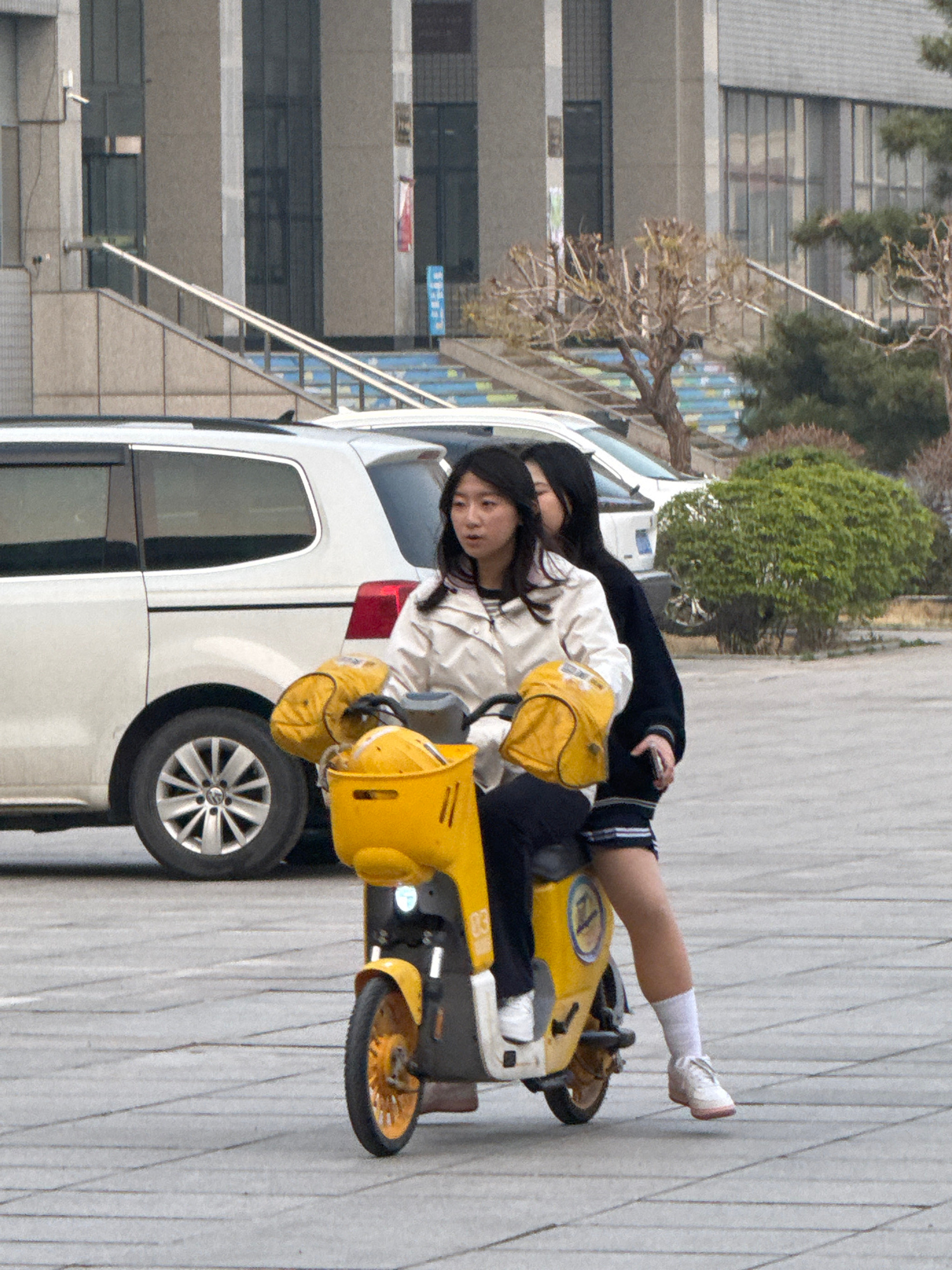 Two females are on a yellow motorized scooter next to a white van on a paved surface. One female is operating the scooter, while the other is seated behind. The location appears to be an urban setting…read more