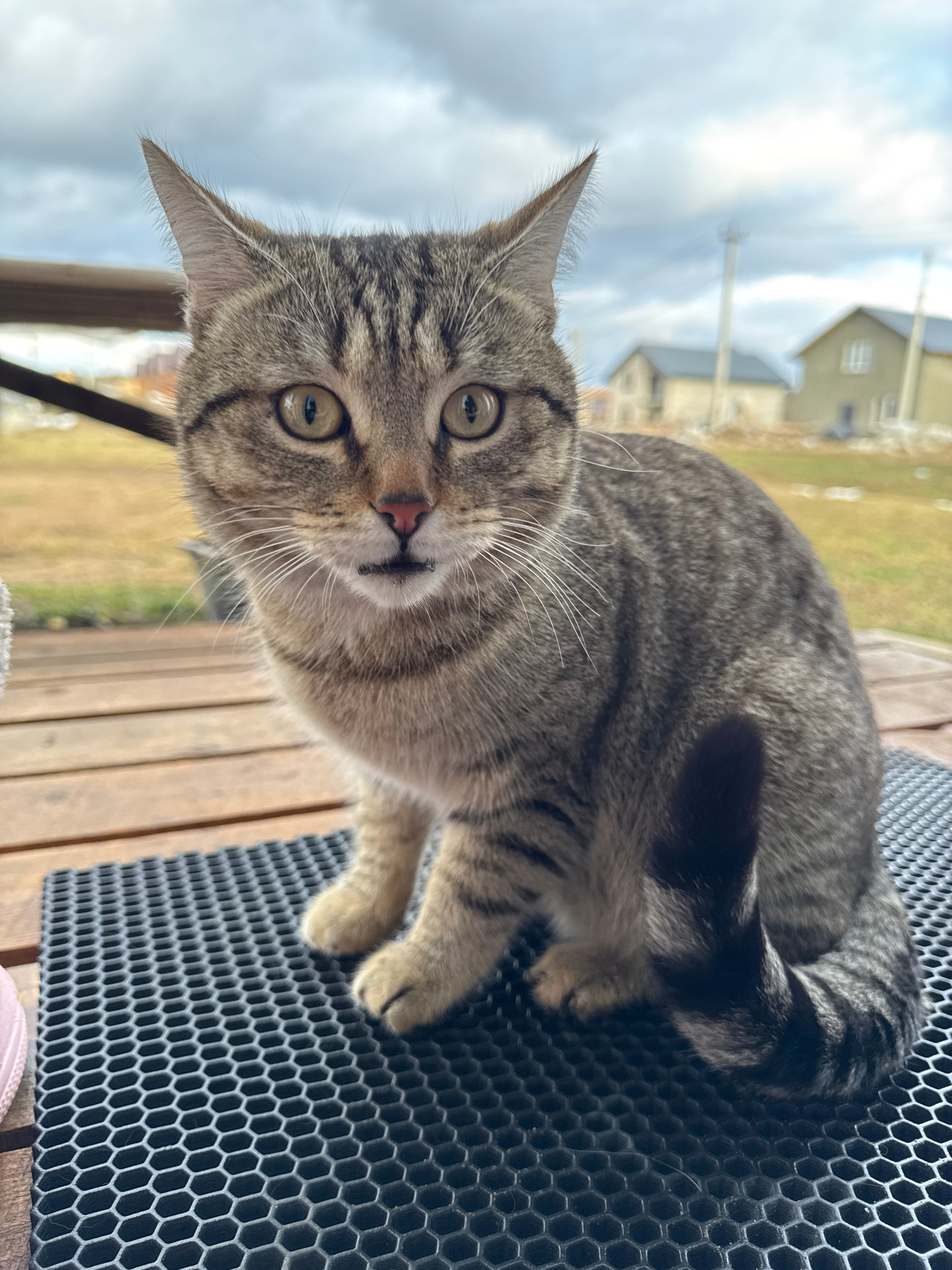 A tabby cat is lying on a black, honeycomb-patterned mat on a wooden deck. The cat has green eyes and is looking directly at the camera. In the background, there is a building and a grassy area under…read more