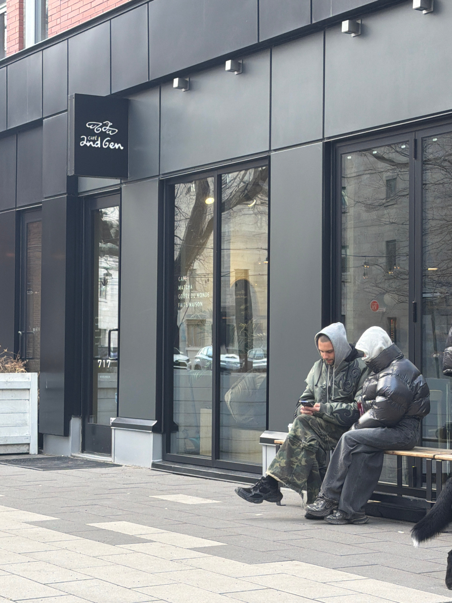 The image shows the exterior of "Café 2nd Gen" located at 717 in Montreal, Canada. Two individuals are seated on a bench outside the café. The first person is wearing a grey hooded sweatshirt, a green…read more
