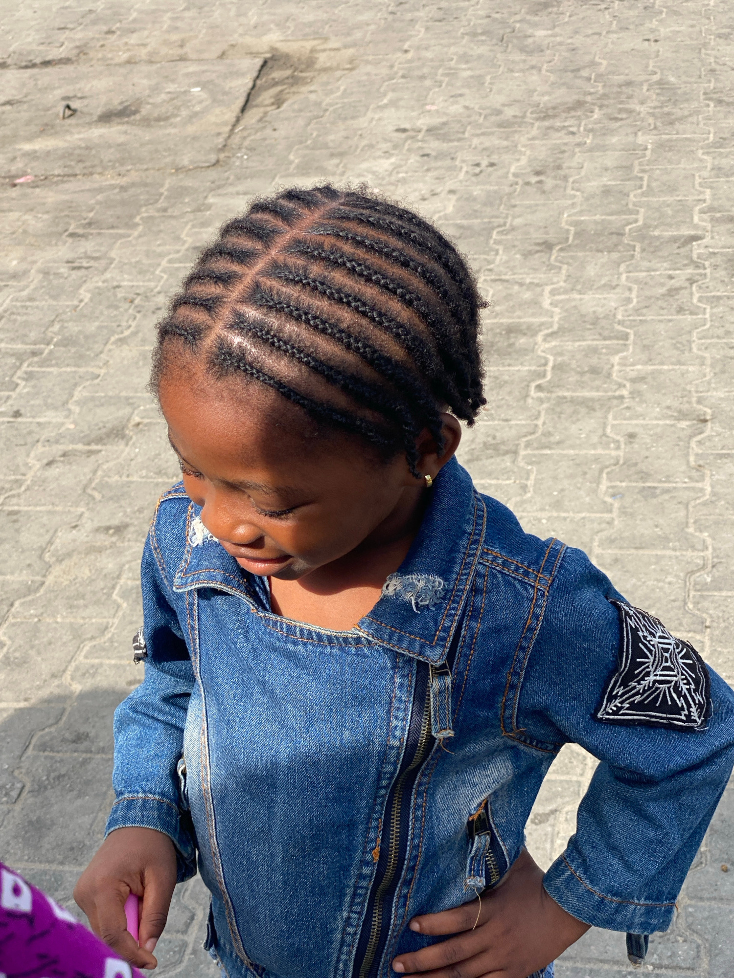 A young girl with dark skin and hair braided in neat rows is standing on a paved surface, possibly a sidewalk or street. She is wearing a blue denim jacket with a black and white patch on the left sleβ¦read more