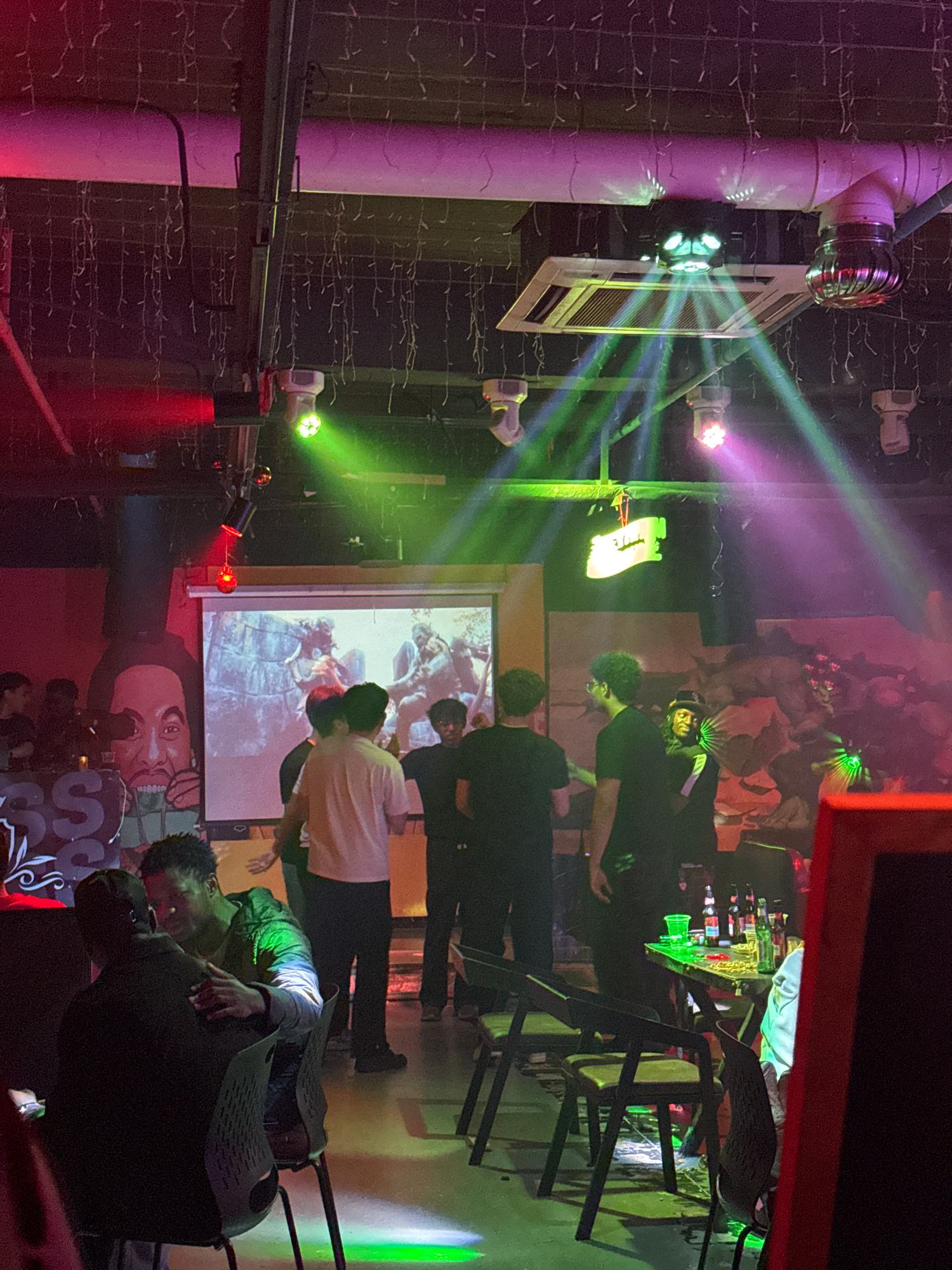 The image depicts an indoor scene, likely in a bar or club, characterized by dramatic lighting and a crowd of people. The lighting includes red, green, and purple hues, illuminating various parts of t…read more