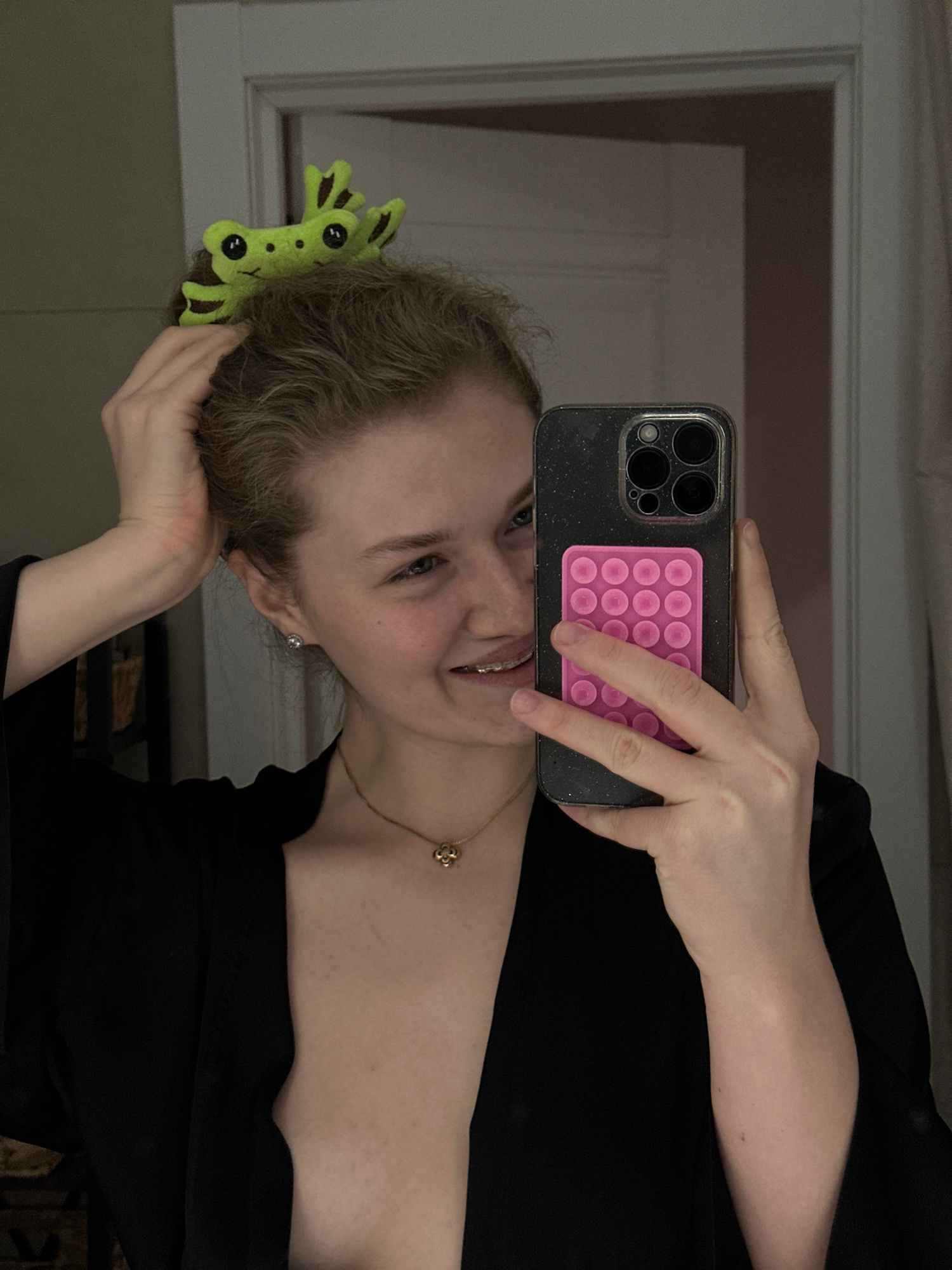 A mirror selfie shows a fair-skinned person with light brown hair, wearing a black top and a gold necklace with a flower pendant. They are holding a smartphone with a black, glittery case and a pink “…read more