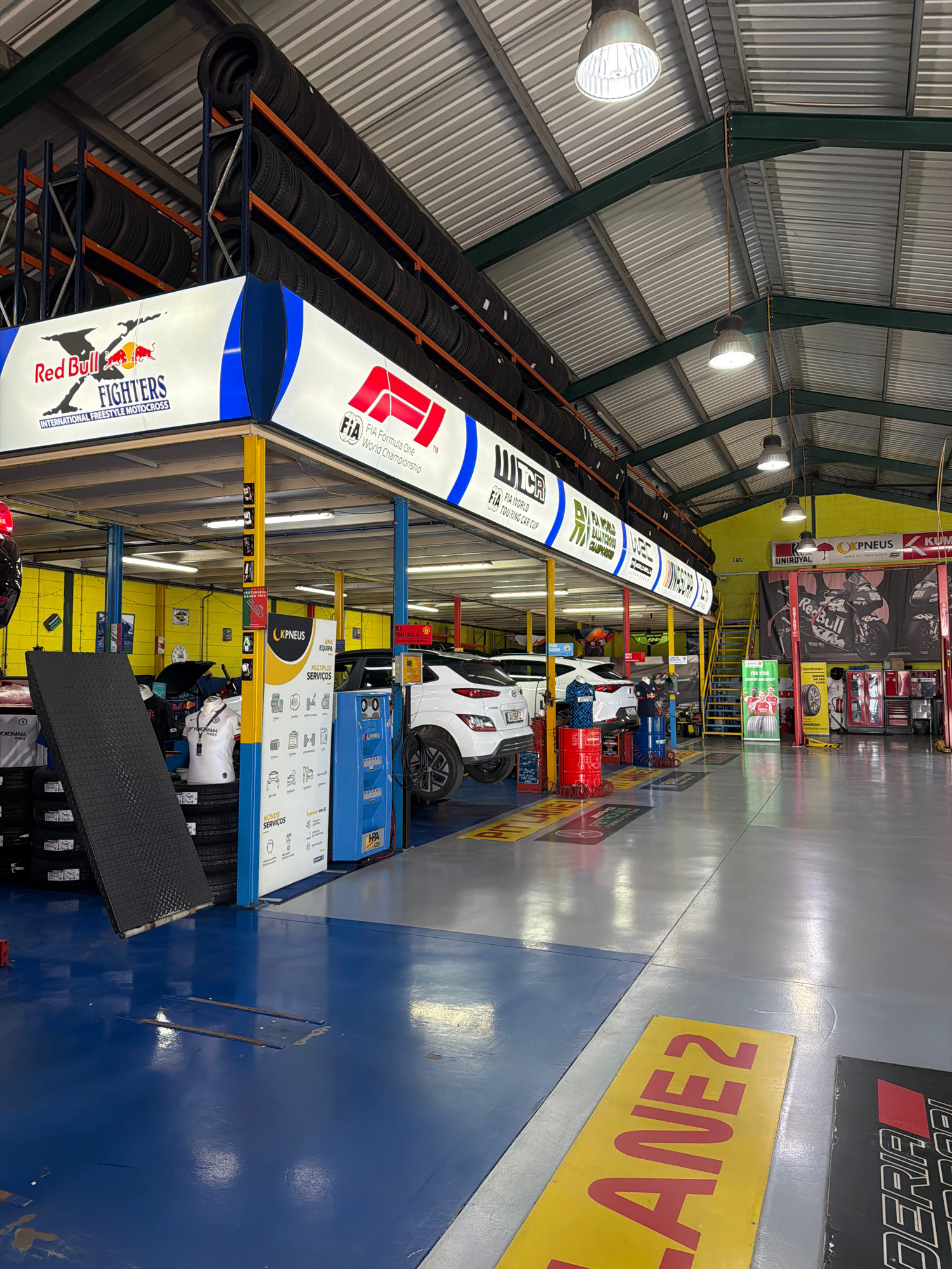 The image depicts the interior of a car service center or garage, likely in Vila Real, Portugal, given the Portuguese text on signs. The structure has a high ceiling with industrial lighting and a met…read more