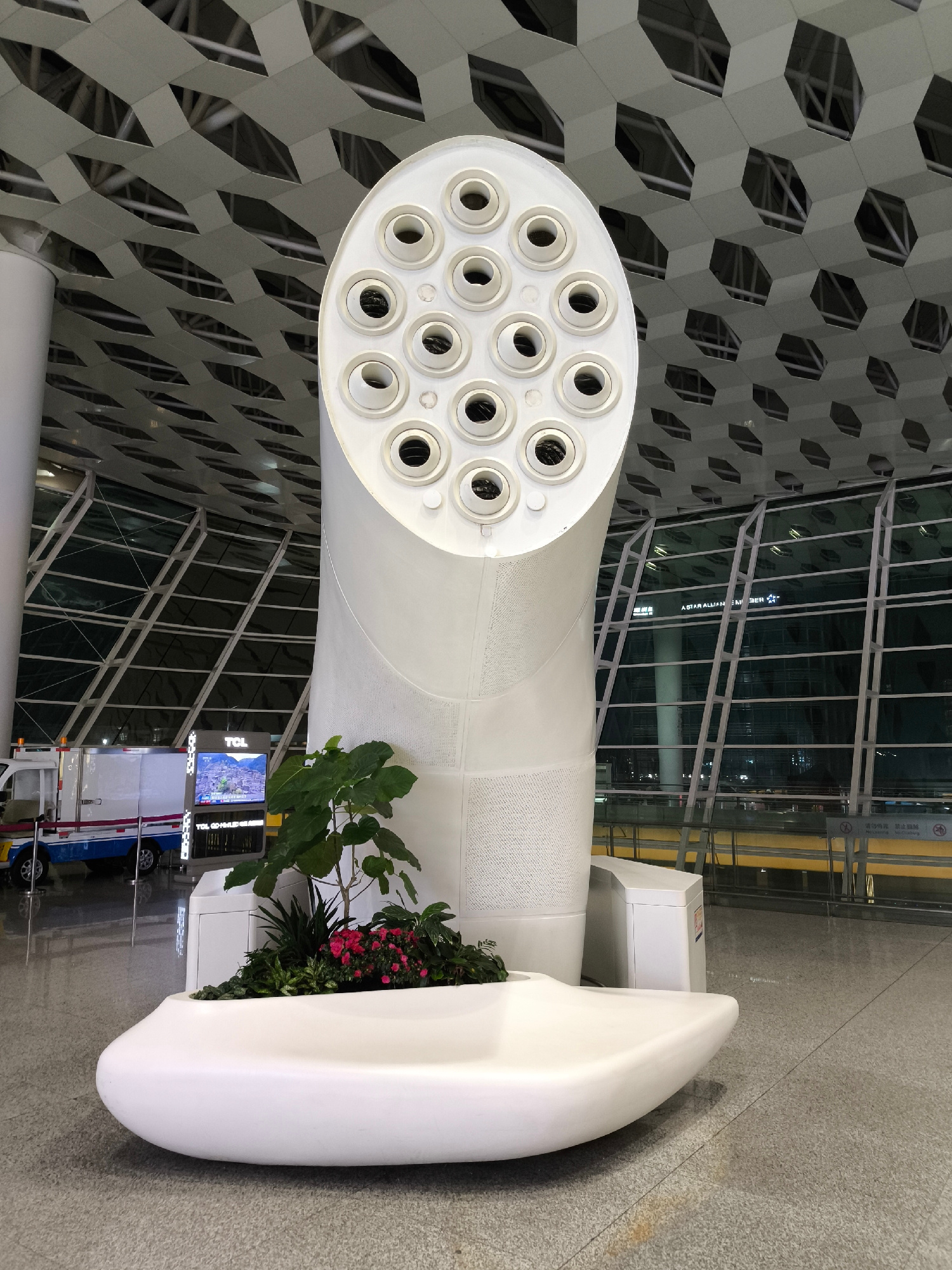 The image depicts a modern, indoor scene, likely inside an airport terminal. A large, white, cylindrical structure dominates the foreground. The top of the cylinder is shaped into an oval with multiplβ¦read more