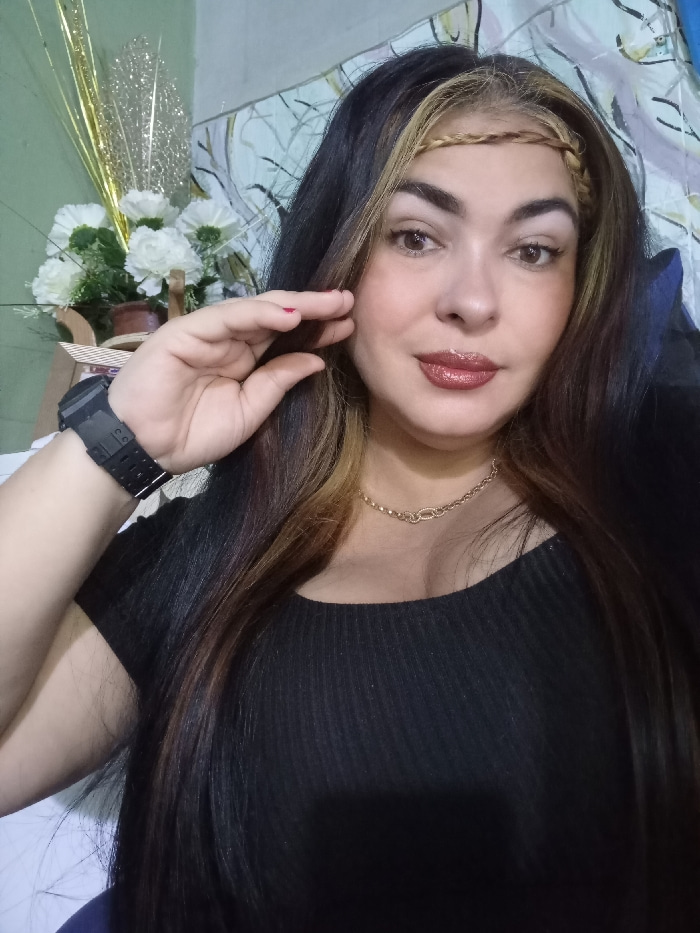 A woman with long, dark hair and a braid-like headband poses for a selfie. She wears a black, fitted top and a gold chain necklace. A large black watch is visible on her left wrist. Her makeup include…read more