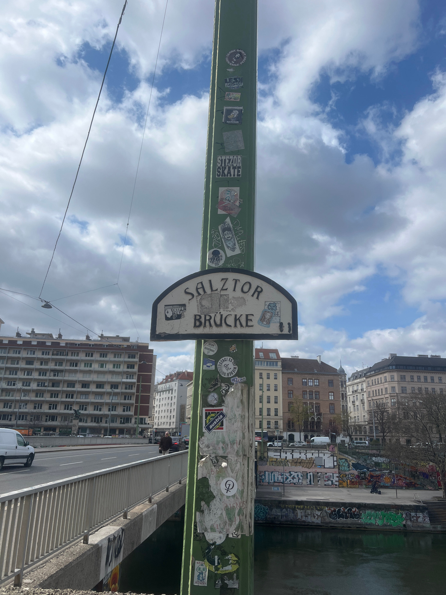 The image depicts a bridge in Vienna, Austria, specifically the "Salztorbrücke," as indicated by the sign. The bridge's structure, painted green, is covered with stickers and graffiti. In the backgrou…read more