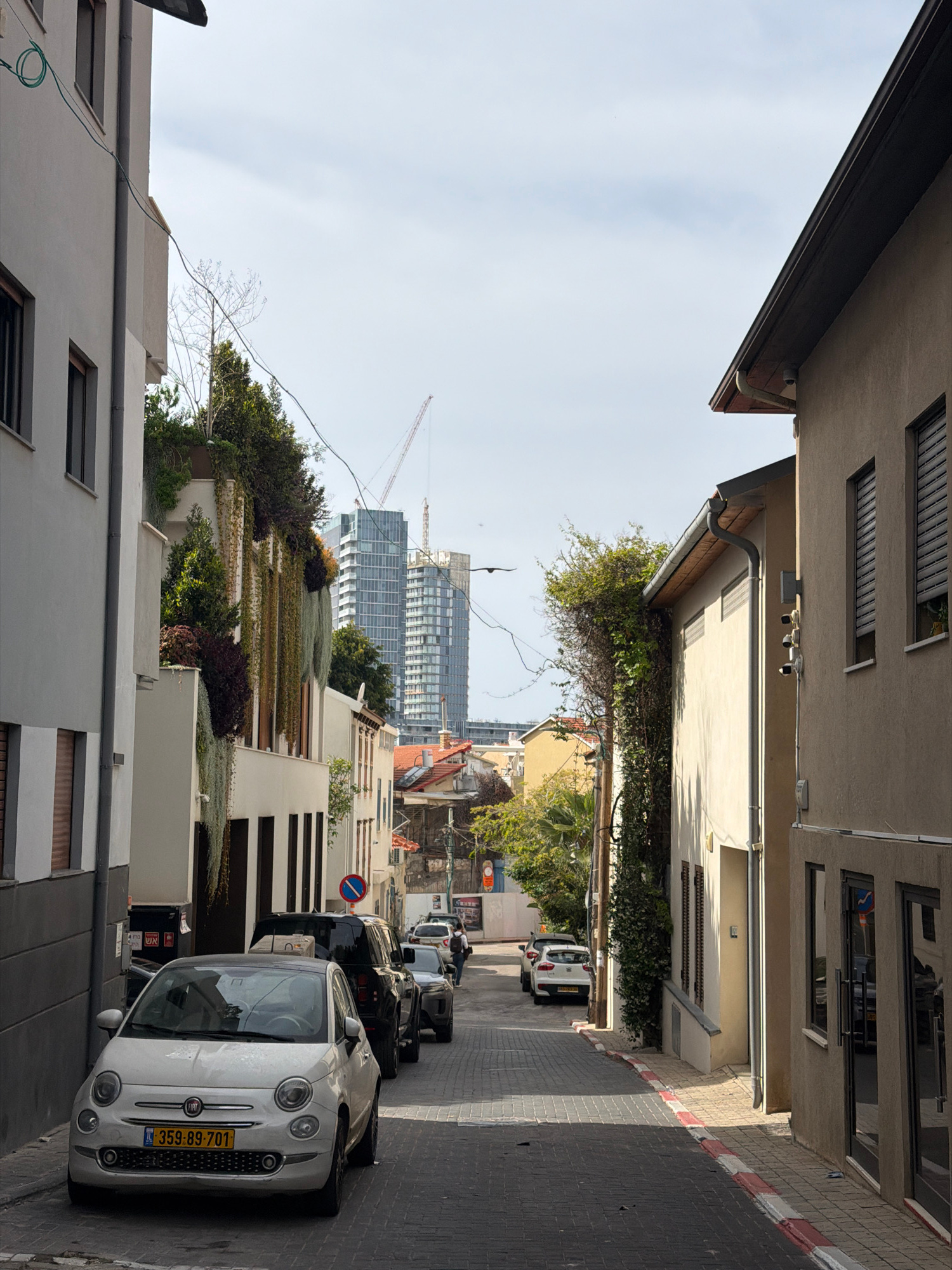 The image depicts a narrow street in Tel Aviv, Israel. The street is lined with buildings, some of which are covered in greenery. Several cars are parked along the street. In the distance, modern skys…read more