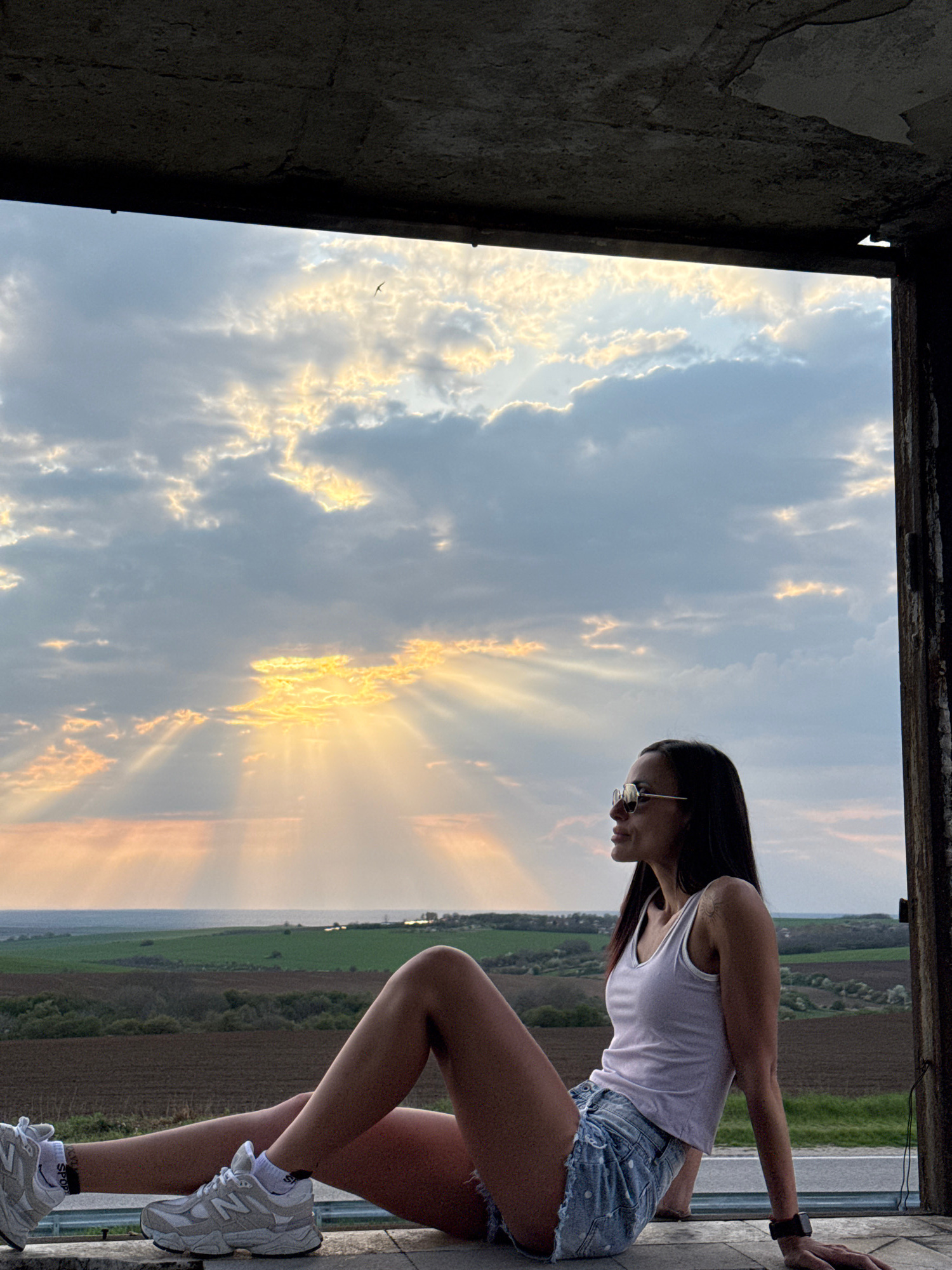 A young woman in a white tank top and denim shorts stands in a window frame. The background showcases a sunset with clouds. She is wearing sunglasses and sneakers. The scene is located in Pleven, Bulg…read more