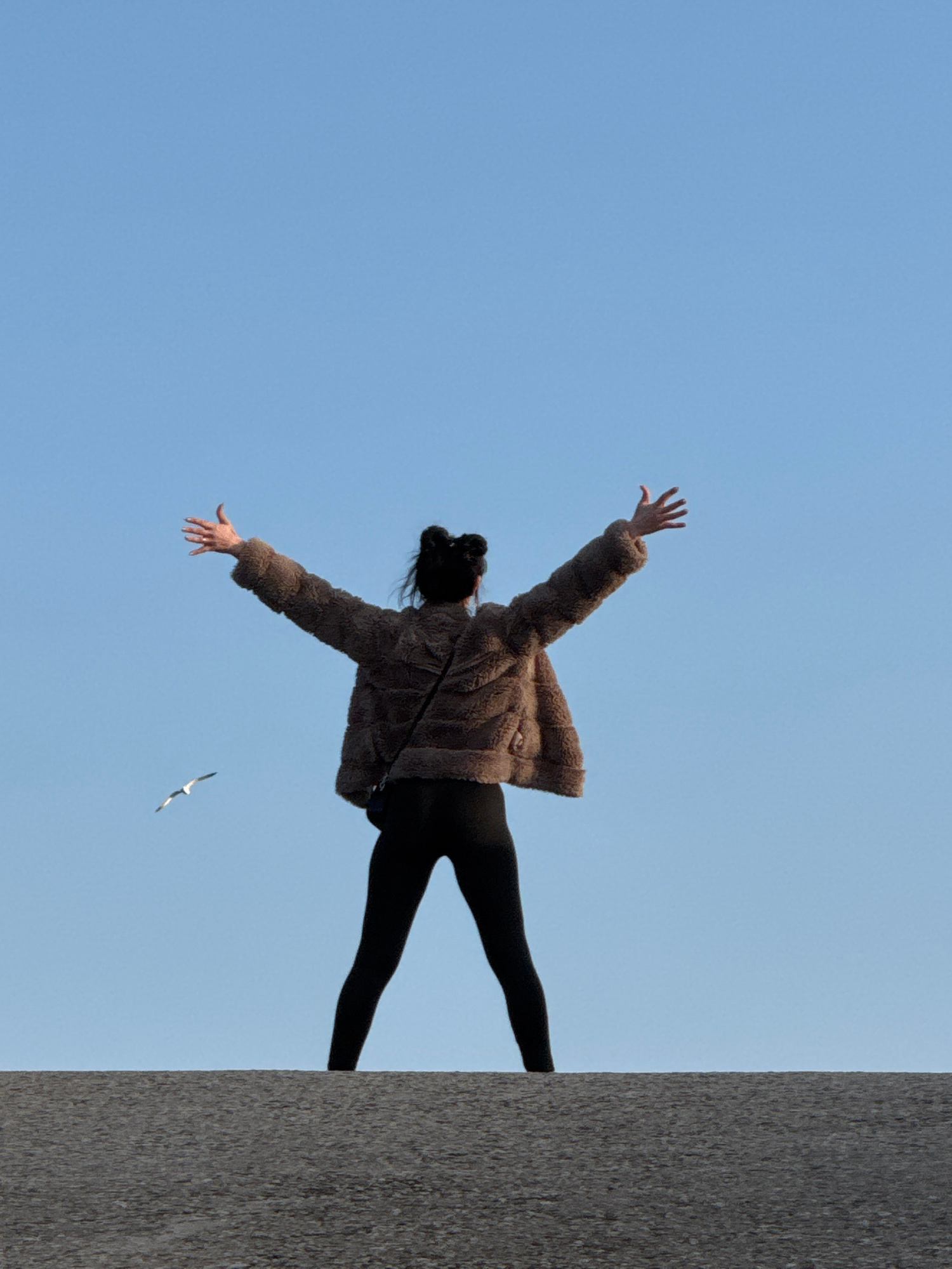 The image depicts a woman standing on the edge of a tall, gray, textured structure in Balgarevo, Bulgaria, with a clear blue sky as the background. She is wearing a brown, fuzzy jacket and black leggi…read more