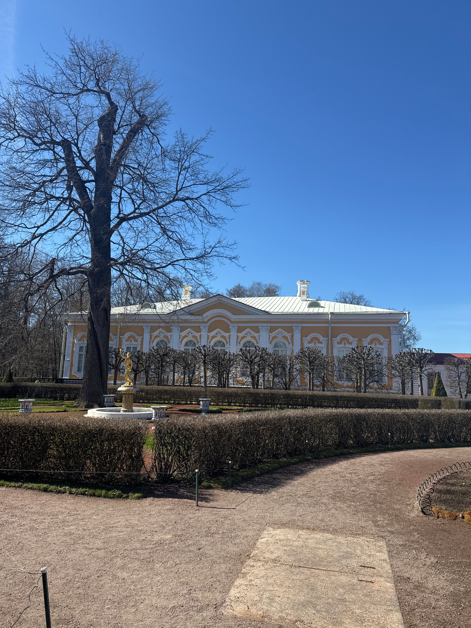 The image captures a grand architectural scene within a formal garden, likely in Peterhof, Russia, under a clear, bright blue sky. A large, ornate building, predominantly light yellow with intricate w…read more