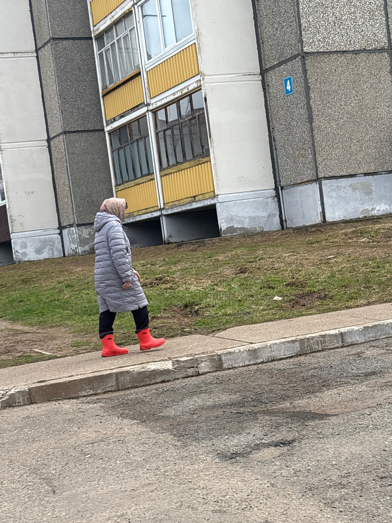The image shows a woman walking on a sidewalk in Марковский, Russia. She is wearing a grey padded coat, black pants, and bright orange rubber boots. To her left is a grassy area, and beyond that is a…read more
