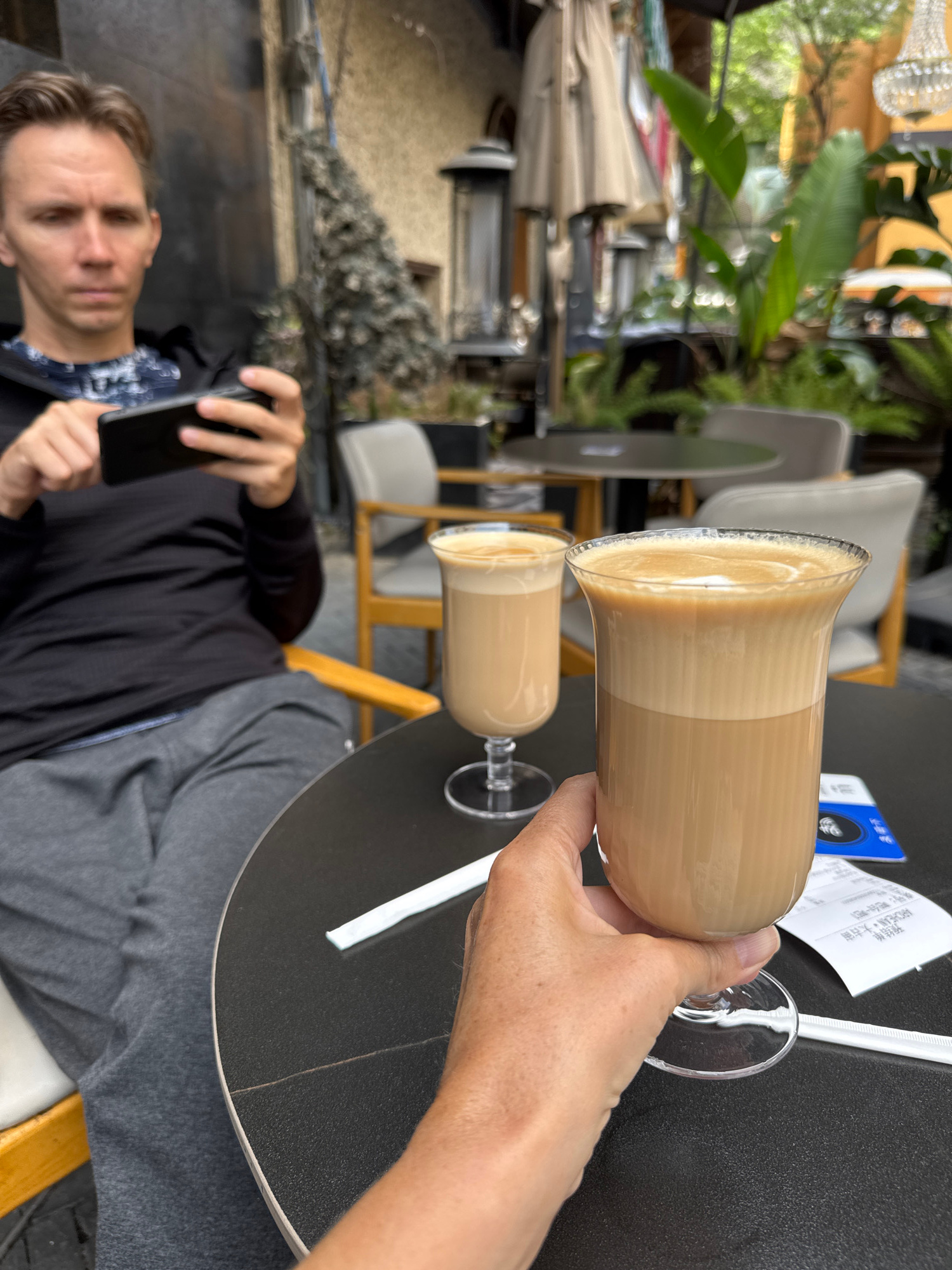 A person is holding a glass of coffee or a latte in their right hand over a round black table, while another person is seated and using a smartphone to take a picture. There are two drinks on the tabl…read more