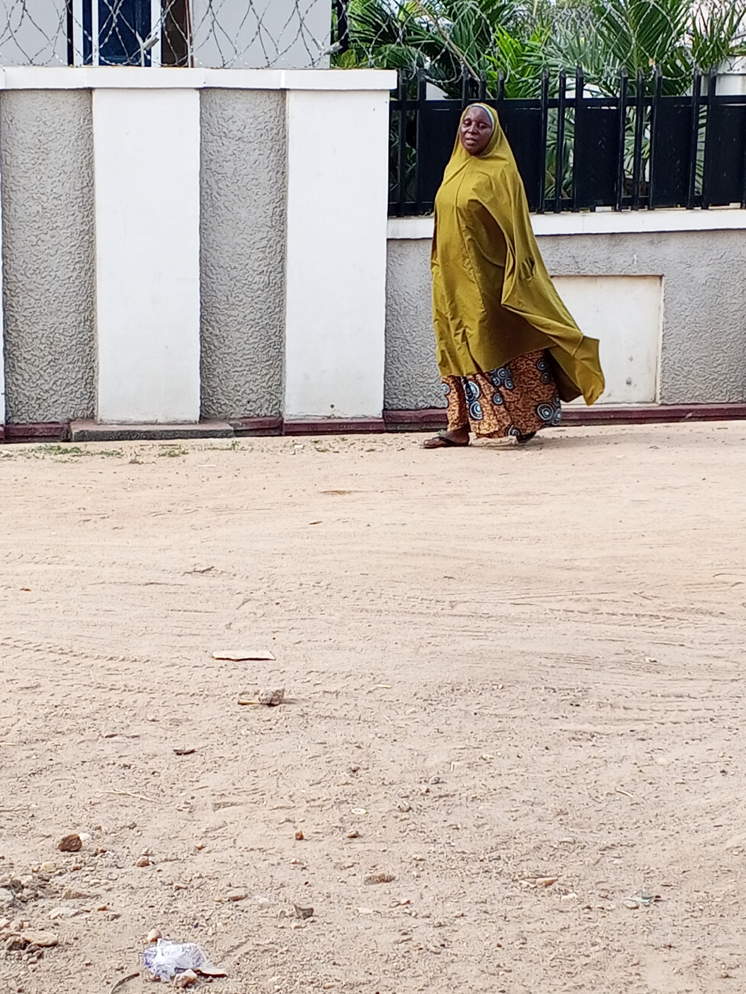 A woman is walking on a dirt road in Zango-ndaji, Nigeria. She is wearing a long, flowing, olive-green robe over a patterned skirt, and sandals. Behind her is a white and gray wall, topped with barbed…read more