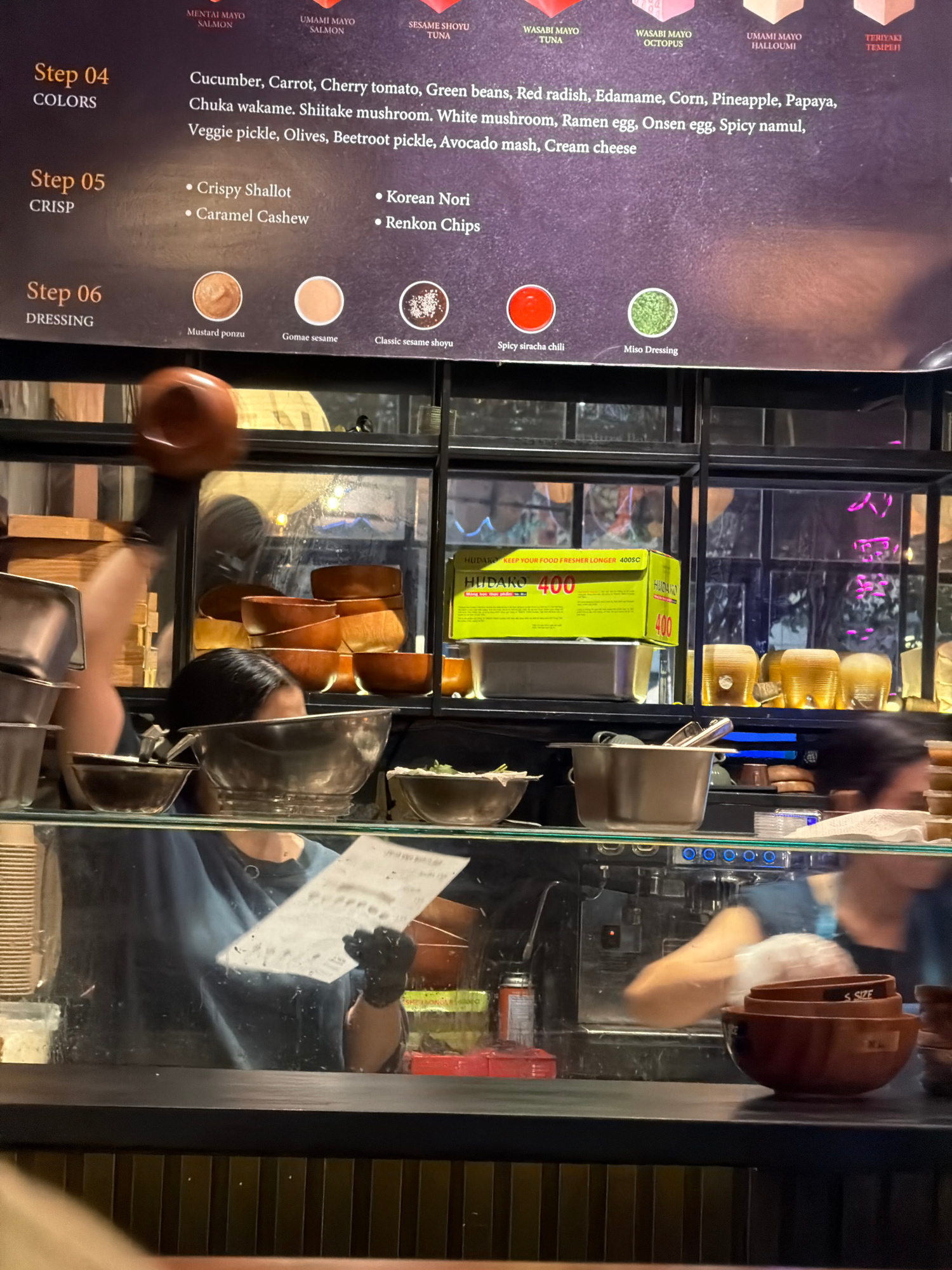 The image shows the interior of a food preparation area, likely in a restaurant or deli in Đà Nẵng, Vietnam. A menu is visible on the left, outlining steps to create a dish with options for colors (ve…read more