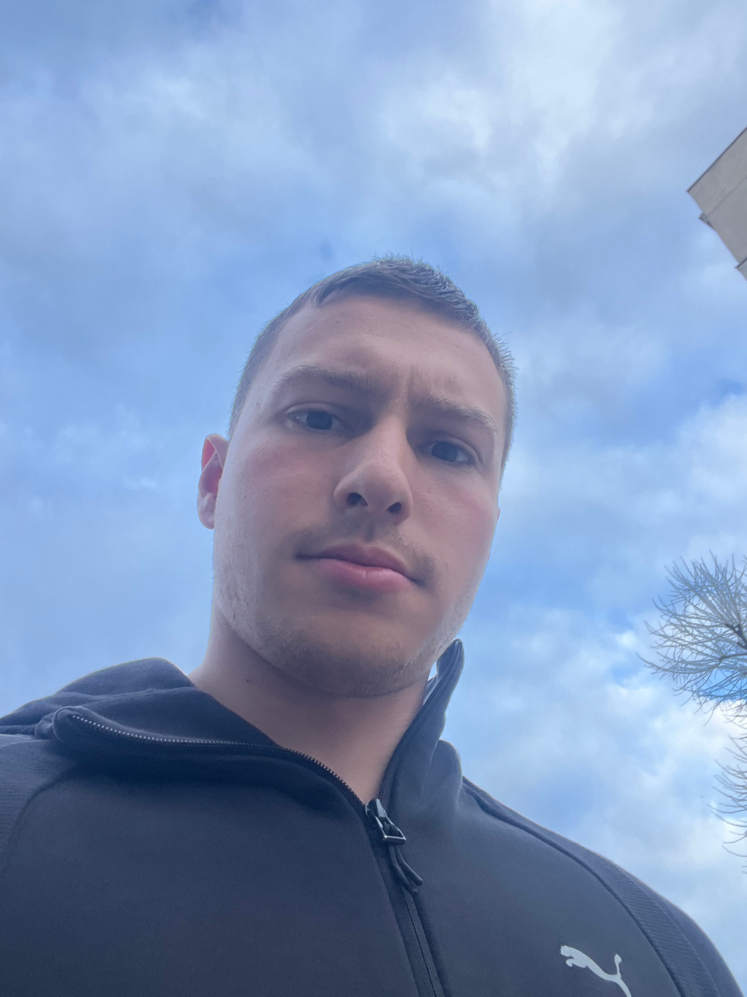 A low-angle selfie of a young man with short hair and fair skin. He is wearing a black zip-up Puma jacket. The background consists of a cloudy sky. It is not possible to determine the location in Burg…read more
