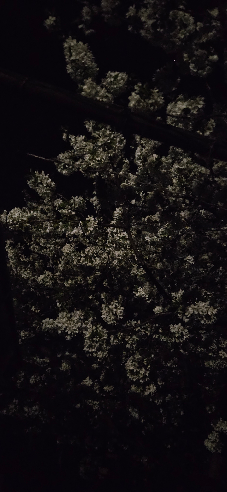 The image shows a tree at night, possibly in Kostenets, Bulgaria. The tree has dense foliage with what appears to be white flowers or blossoms. The lighting is dim, making it difficult to discern fine…read more