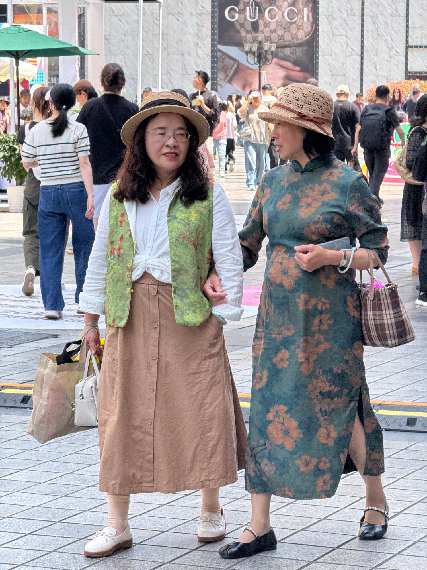 The image captures two women in the foreground on a bustling urban street, with numerous other people and buildings in the background. The scene is brightly lit, suggesting a sunny daytime. The woman…read more