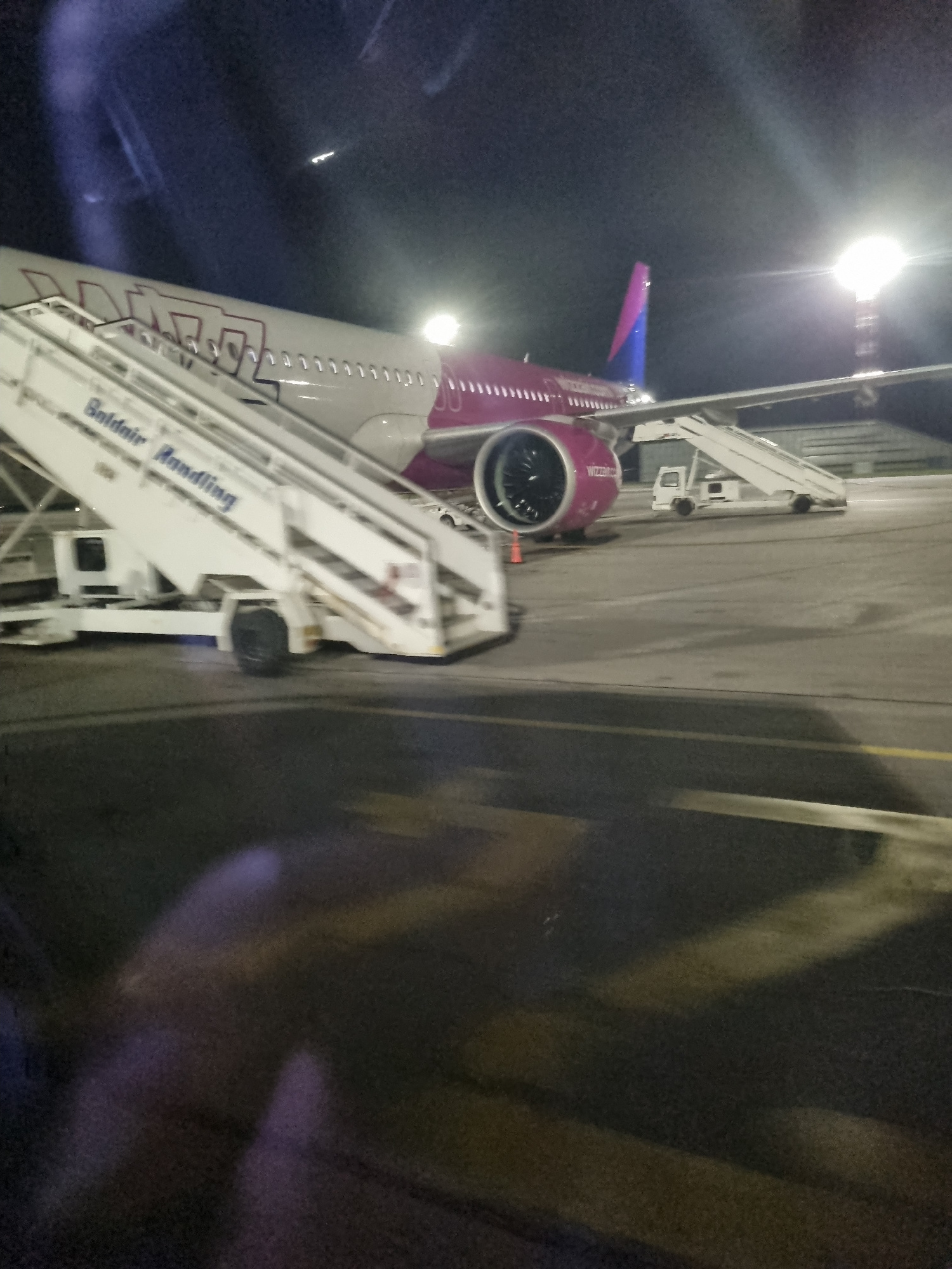 The image shows an airplane parked at an airport, likely at night, based on the ambient lighting and dark sky visible. The airplane is white with pink and blue accents on the tail. Stairs are positioned next to the airplane, indicating that passengers are boarding or disembarking. The stairs bear the name "Safdair Handling." The setting appears to be an airport apron, with visible tarmac and possibly other airport infrastructure nearby. The location is identified as the city of Sofia, Bulgaria, but the exact location within the airport is not specified. No people are visible in the image. | Open Wire