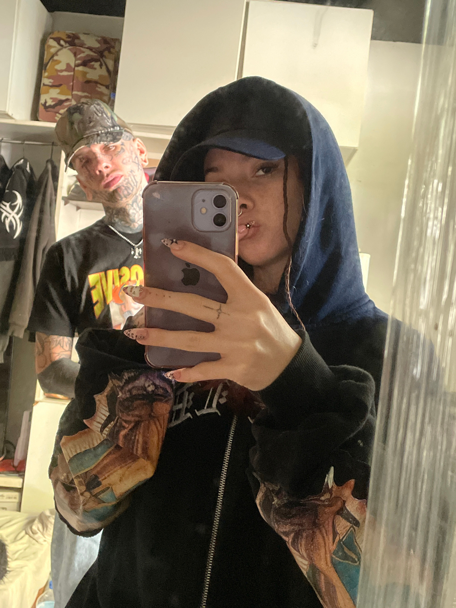 A person is captured in a mirror selfie, holding an iPhone with a light purple case. The main subject, positioned on the left side of the frame, wears a dark blue hoodie, with their face partially vis…read more