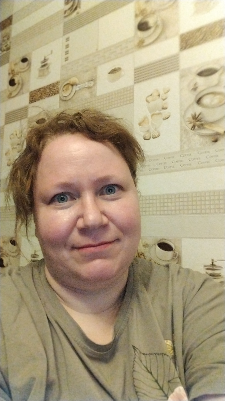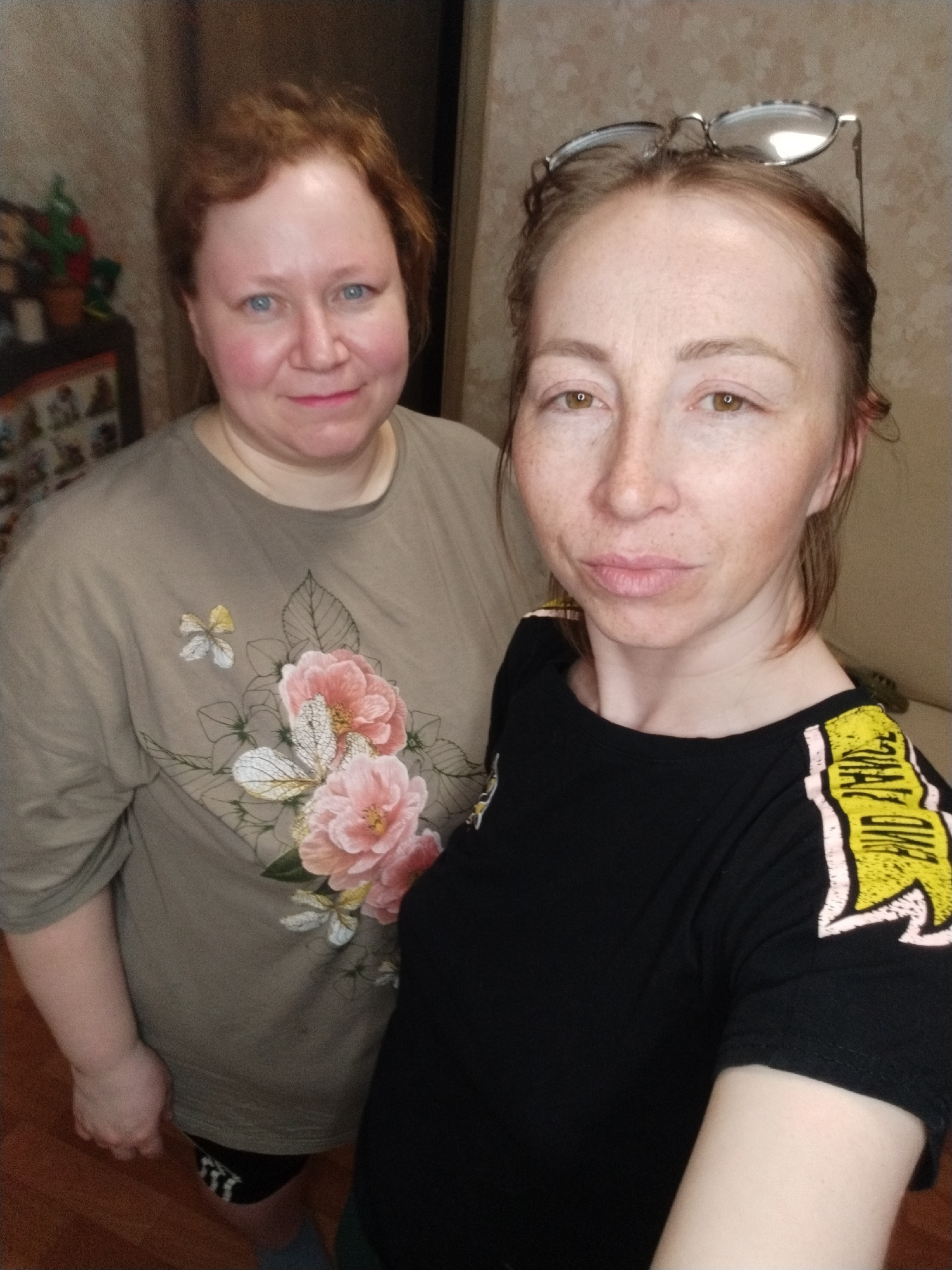 Two women stand close together indoors, taking a selfie. The woman on the left has fair skin, reddish-blonde hair, and blue eyes. She is wearing a light brown t-shirt with a floral design on the front…read more