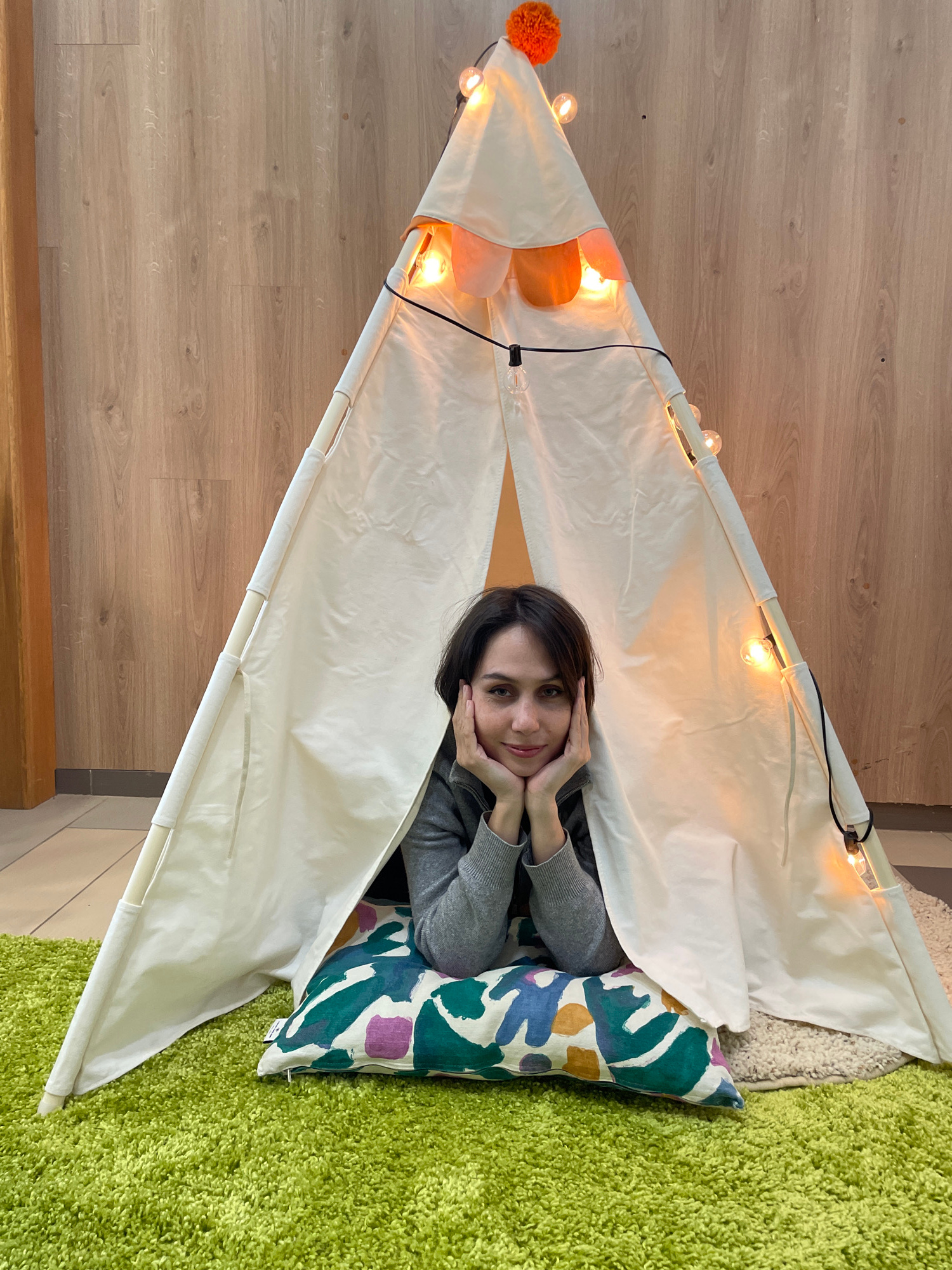 A woman is lying inside a white teepee tent adorned with string lights. She is resting her face in her hands and smiling. The tent is on a rug that is partly green and partly beige. The floor surround…read more