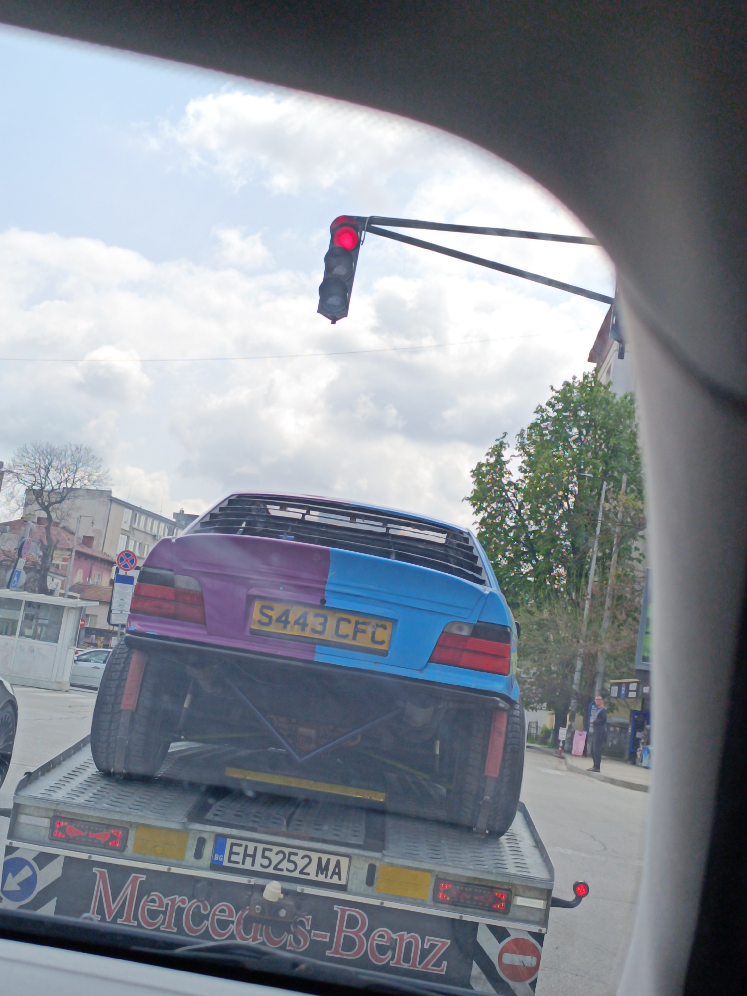The image shows a two-tone, purple and blue car with a license plate reading "S443 CFC" being transported on a Mercedes-Benz tow truck with the license plate "EH5252 MA". The tow truck is in an urban…read more